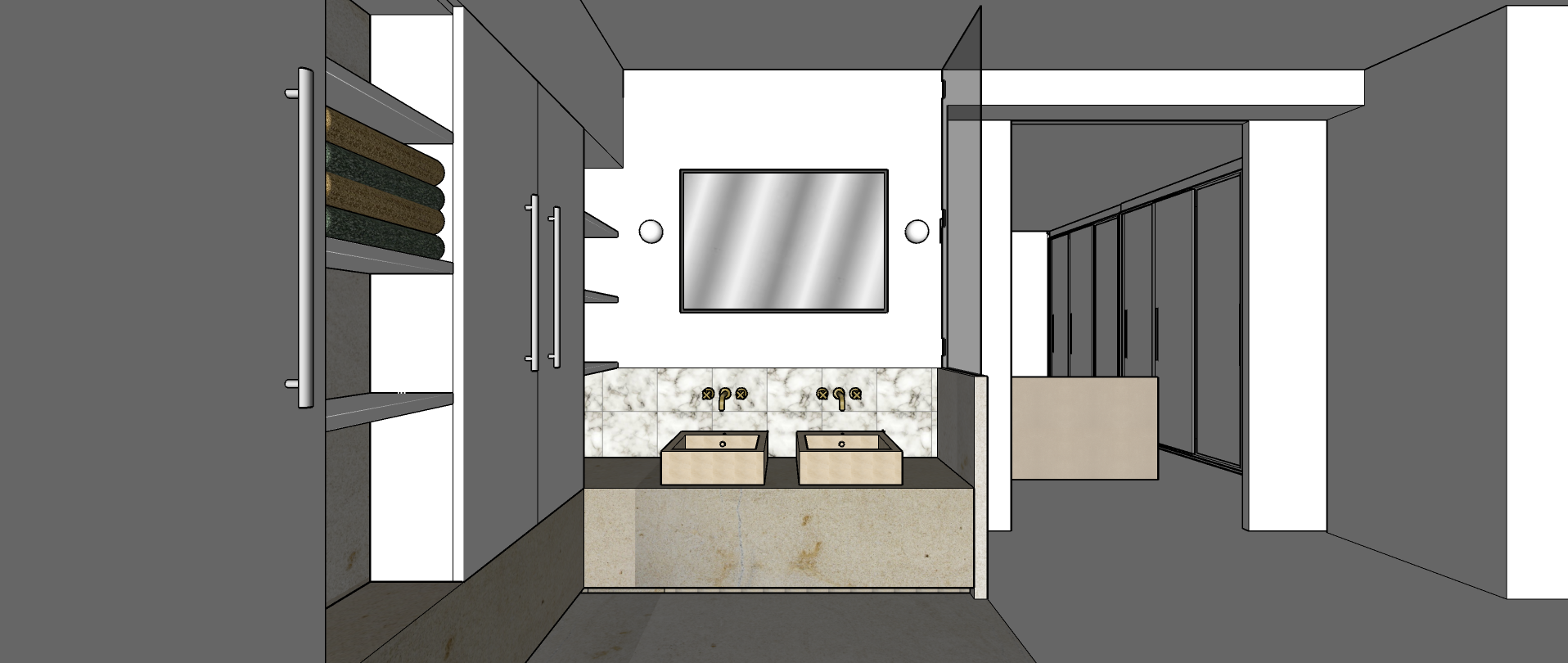 this is the bathroom of an elegant modernist house that we wish to renovate this is the sink area we have a lower section in beige burgundy stone as is the floor the cupboards on the left are made of wood and then we have wall lights on either side of the mirror to the right at the back you can see the bedroom which can be closed off by a sliding door