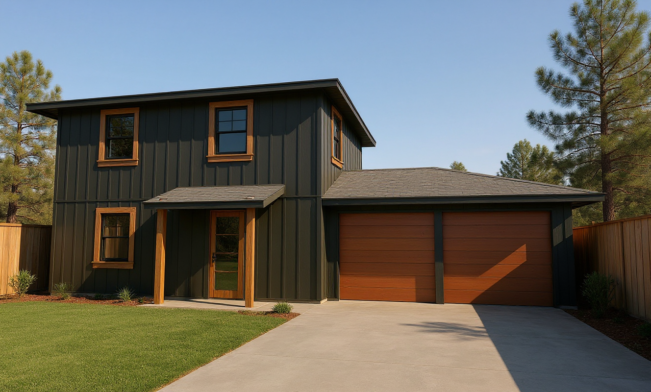 remove trees and please do an elevation view just lines of this house with 2 10 foot wide by 7 foot tall shed roof dormer in between the two chimneys eliminate the chimneys and in their place do two wider dormers