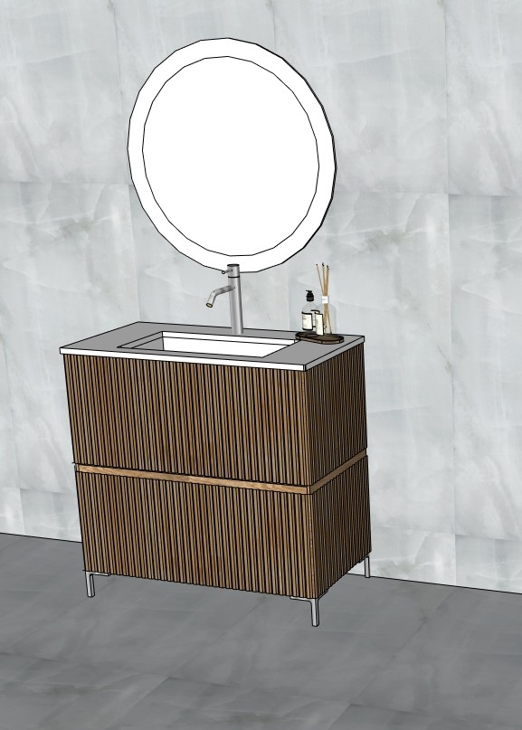the colour of the wood is dark oak and the round mirror has frame made of disco ball material