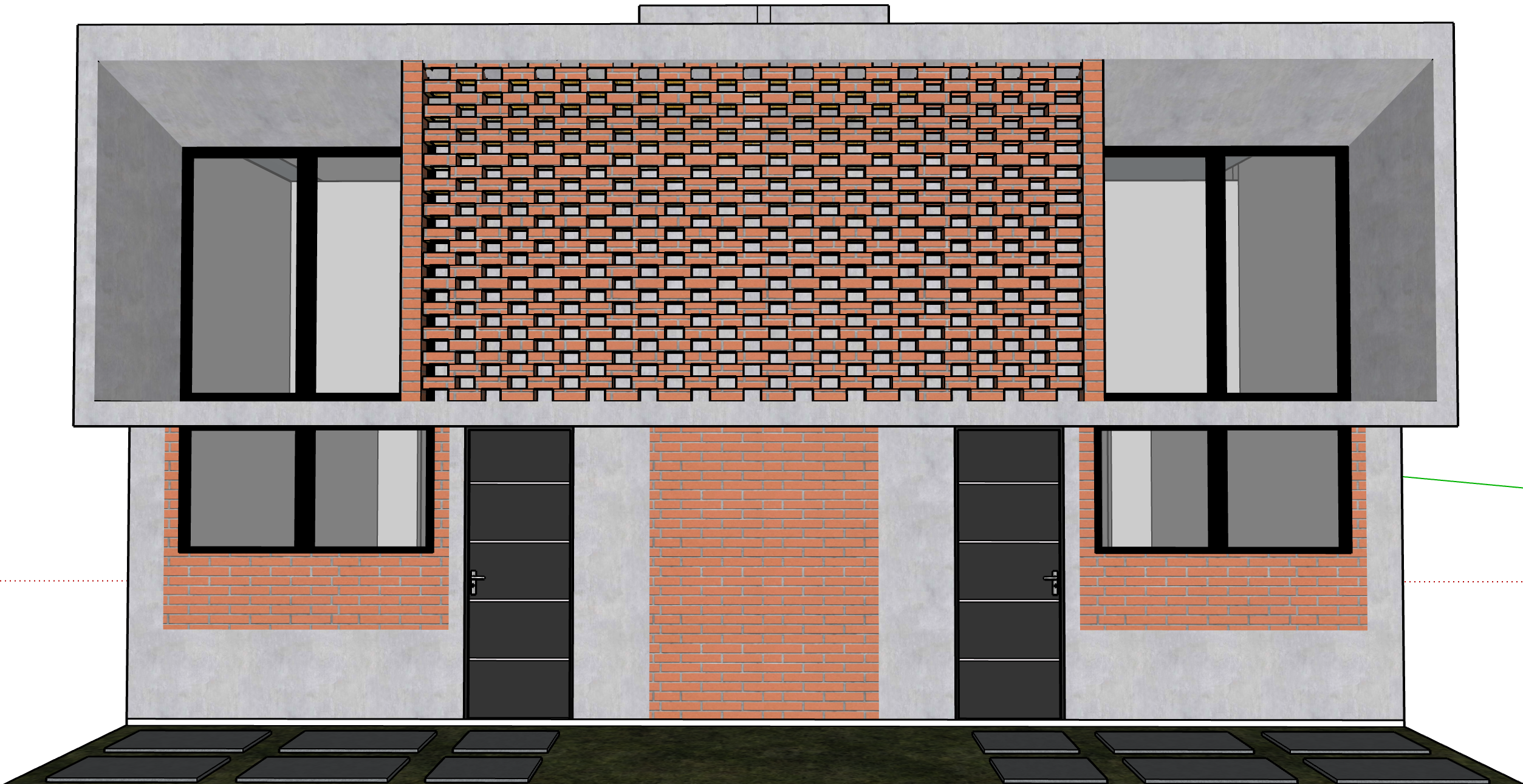 render a modern architectural facade with a blend of colors and textures the building should have a clean and minimalist design featuring a prominent perforated brick wall color orange the surrounding structure is smooth concrete a soft light gray tone accent areas include large clear glass windows framed in bold black offering a stark contrast the atmosphere should be serene and contemporary set against a softly lit neutral sky to enhance the building s details emphasize texture and depth with shadows and highlights to bring out the brick pattern s intricacy