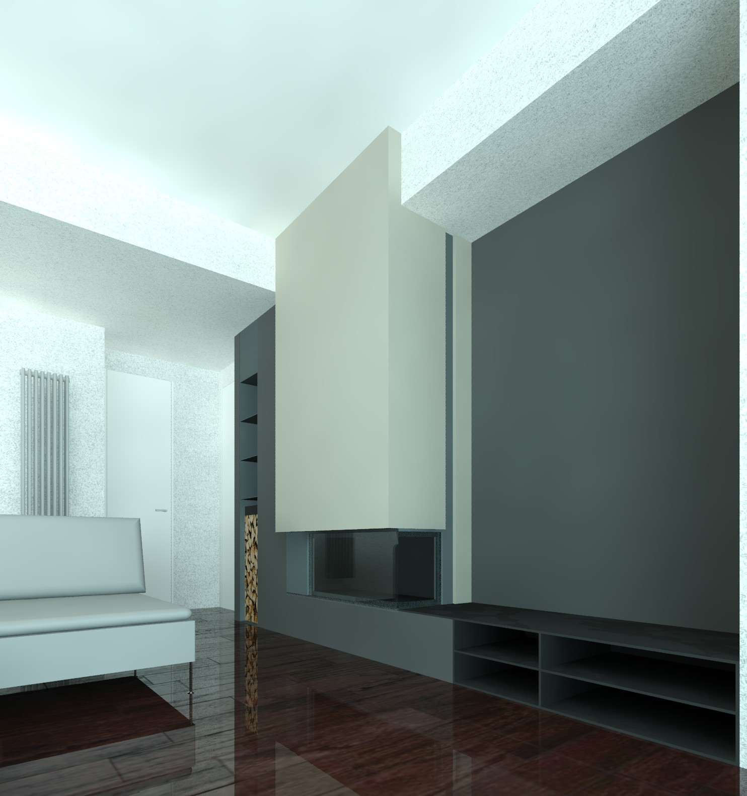 strict photorealistic enhancement preserve 100 original geometry volumes proportions edges alignments perspective and camera position do not redesign or reinterpret architecture maintain clear separation between materials ensure material and lighting consistency across all views natural soft daylight diffused and balanced exposure neutral warm white balance 4600 4800k realistic global illumination soft shadows no overexposed windows fireplace glow only inside firebox with subtle warm spill hungarian herringbone oak parquet floor dark natural oak tone matte finish visible grain low reflectivity subtle plank variation dark wall and fireplace base in lead grey plaster matte slightly textured deep uniform tone clearly darker than upper volume light walls and ceiling in fine white plaster smooth matte diffuse light behavior fireplace upper suspended volume in textured taupe plaster warm grey tone matte clearly distinct from dark wall and base fireplace frame in black matte iron with subtle micro reflections glass transparent with realistic refraction and soft reflections only realistic stacked firewood logs with varied diameters irregular cuts visible bark texture natural cracks color variation from light beige to warm brown visible end grain small shadow gaps between logs high texture detail no repetitive pattern strong depth and contact shadows minimal styling on shelf 3 4 neutral hardcover books beige grey tones one matte ceramic vase one minimal wooden box balanced spacing no clutter high resolution textures physically accurate materials ambient occlusion enabled realistic contact shadows low noise no stylization no material merging