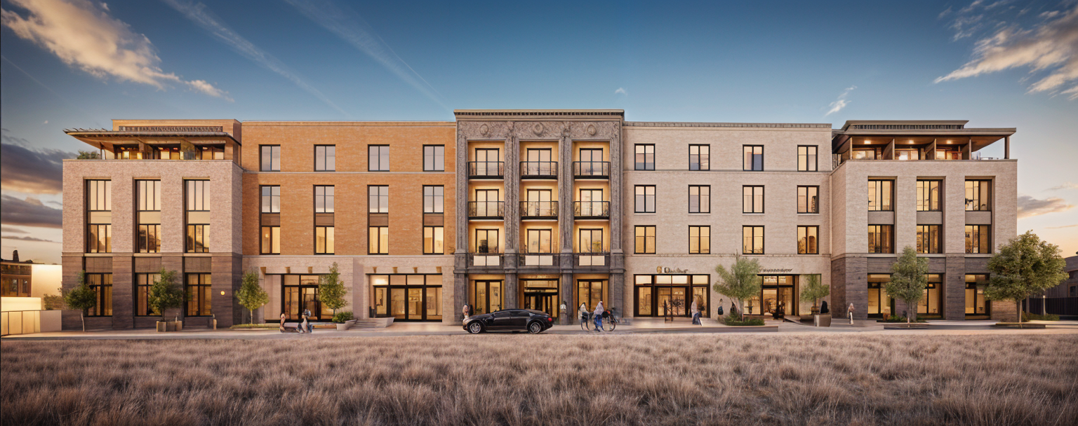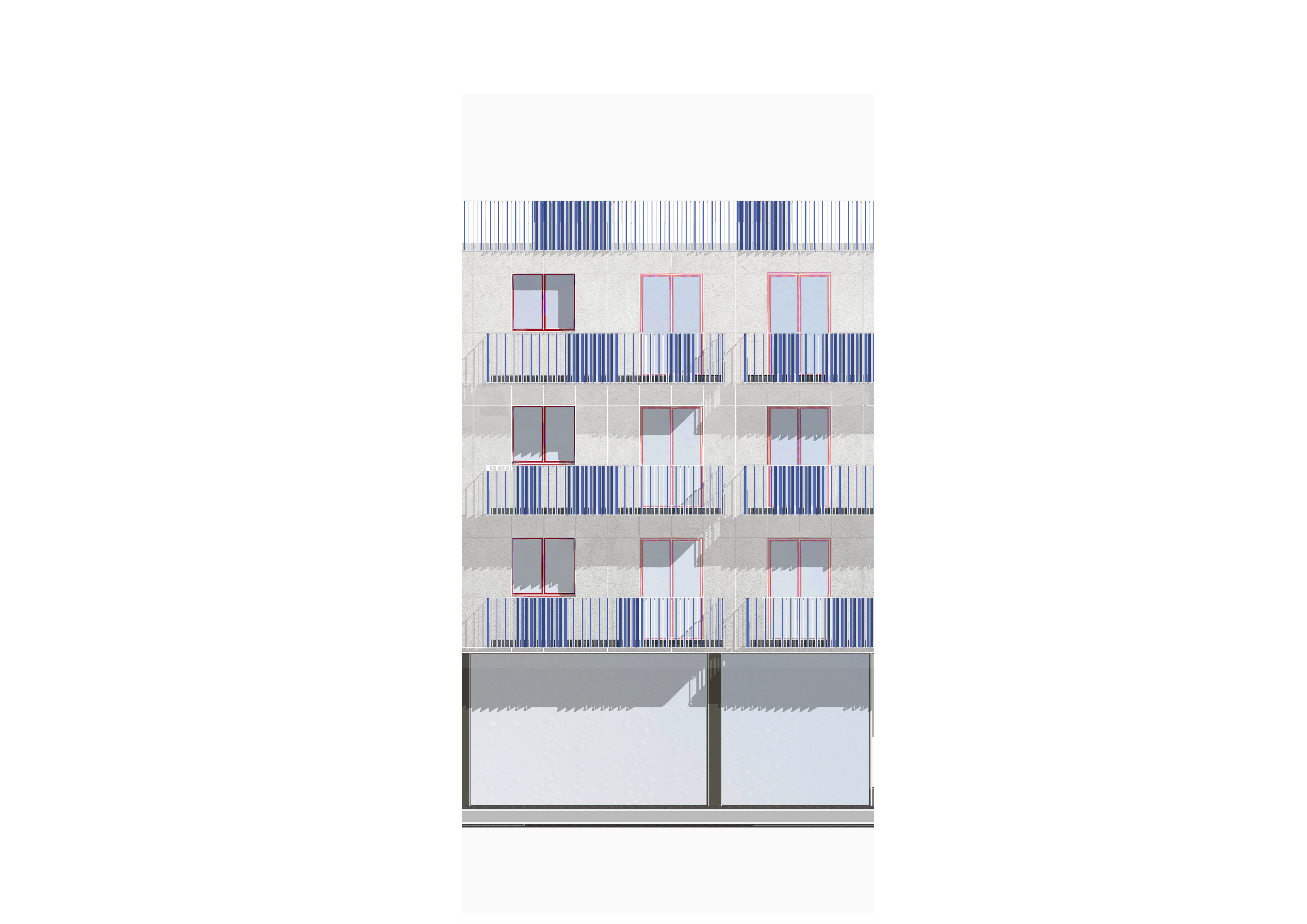i need to take a very realistic photo of the building i need to see very well the metal coloured balaustrade done by different parts and every single detail the concrete slab panels the glasses reflecting clouds and sun and people on the bottom floor i see very well the contrast in between the blue balaustrades and the ivory colour on facade