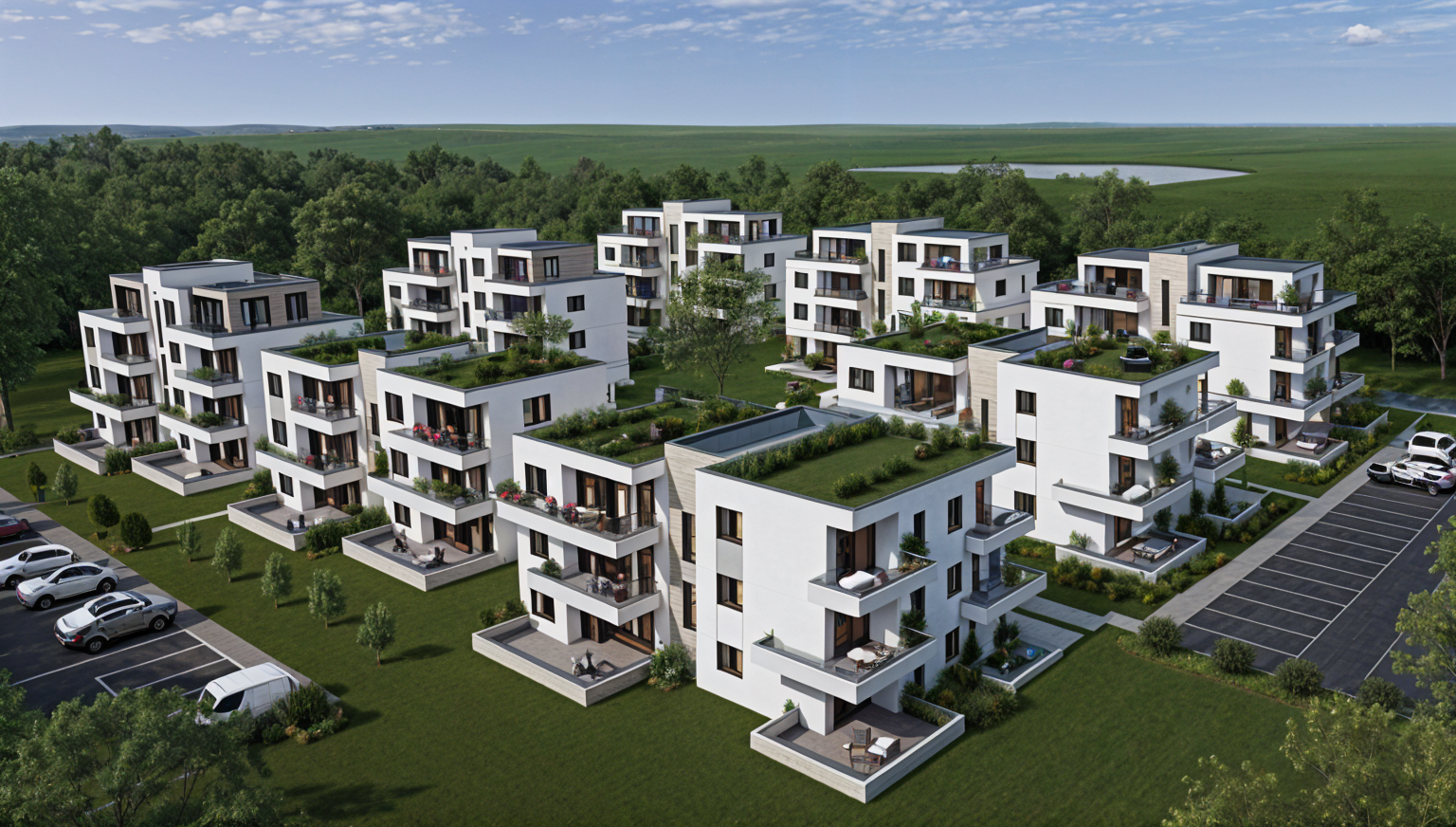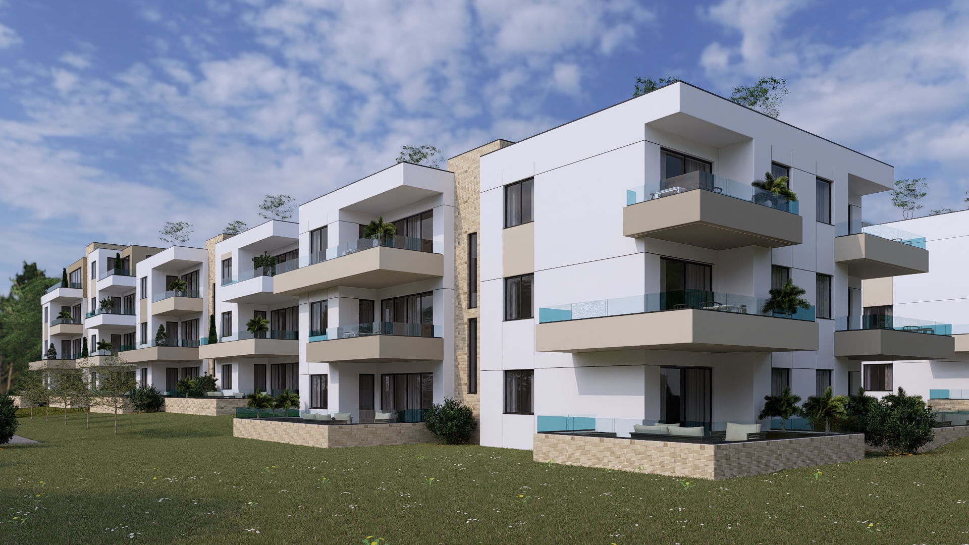 modernist exterior shot modern building with a white facade and beige balconies surrounded by greenery and flowers architecture