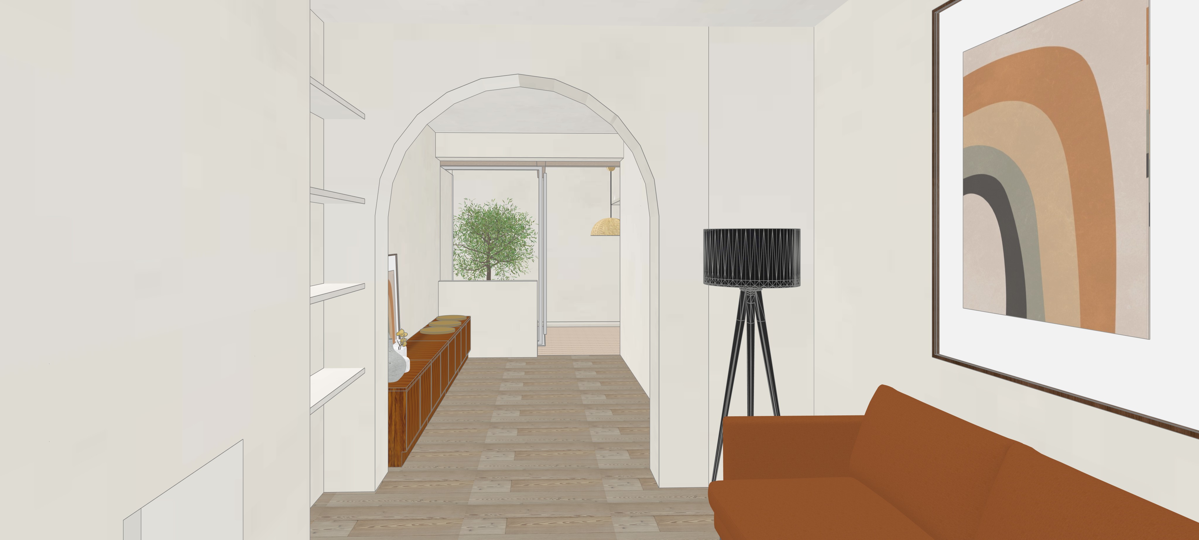 render a cozy mediterranean living room with off white plaster walls bathed in soft natural light the walls are a warm cream color providing a soothing canvas a stylish and curvy off white sofa sits against the wall adding warmth and contrast a trendy ferm living floor lamp adds a contemporary quirk the flooring is light oak long plank with no breaks and brings an earthy feel a large abstract painting with warm beige rust and muted olive tones hangs prominently an elegant wooden console along the left wall exudes sophistication a lush green olive tree plant is visible through a glass door inviting nature inside the atmosphere is serene and inviting perfect for relaxation and contemplation