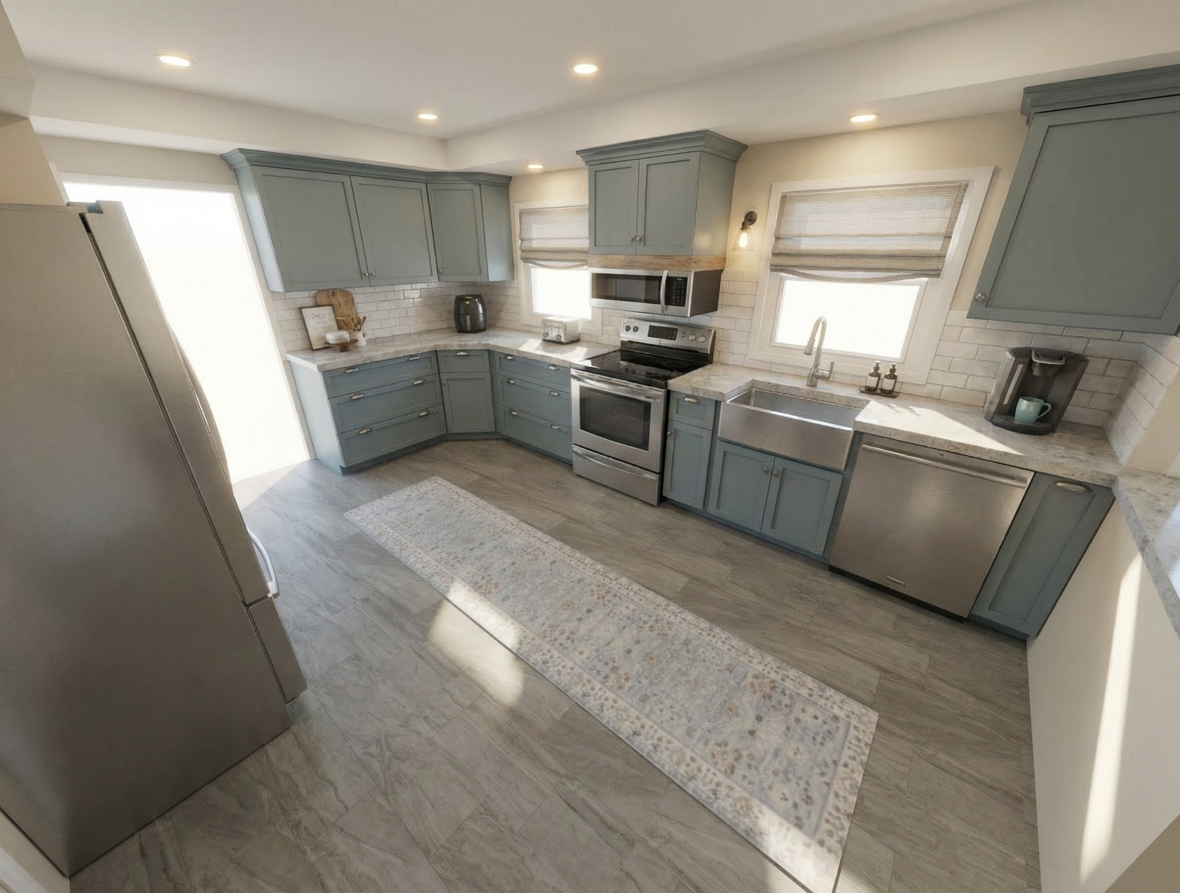 photorealistic architectural rendering of the front elevation of a mid century modern home view angle unchanged from the original model maintain exact material distribution as designed the house features muted natural wood siding and warm earthy brick as already defined in the model strong horizontal rooflines generous glazing and clean geometric forms the home sits on open land surrounded by mature oak trees the front grounds are lush and beautifully landscaped thick healthy green grass layered plantings ornamental grasses low shrubs and subtle native greenery that feels natural yet curated do not add shrubs beyond what is there add 2 cars under the deck south east facing fa ade with warm natural sunlight creating soft shadows and depth under roof overhangs the light feels uplifting and optimistic late afternoon sun golden but not dramatic soft architectural lighting integrated subtly under overhangs and near the entry adding warmth and welcome without overpowering the natural daylight interior lighting warm and inviting visible through glass atmosphere inspiring and welcoming timeless mid century elegance natural color grading soft shadows realistic textures architectural photography style high resolution serene yet vibrant landscape integration