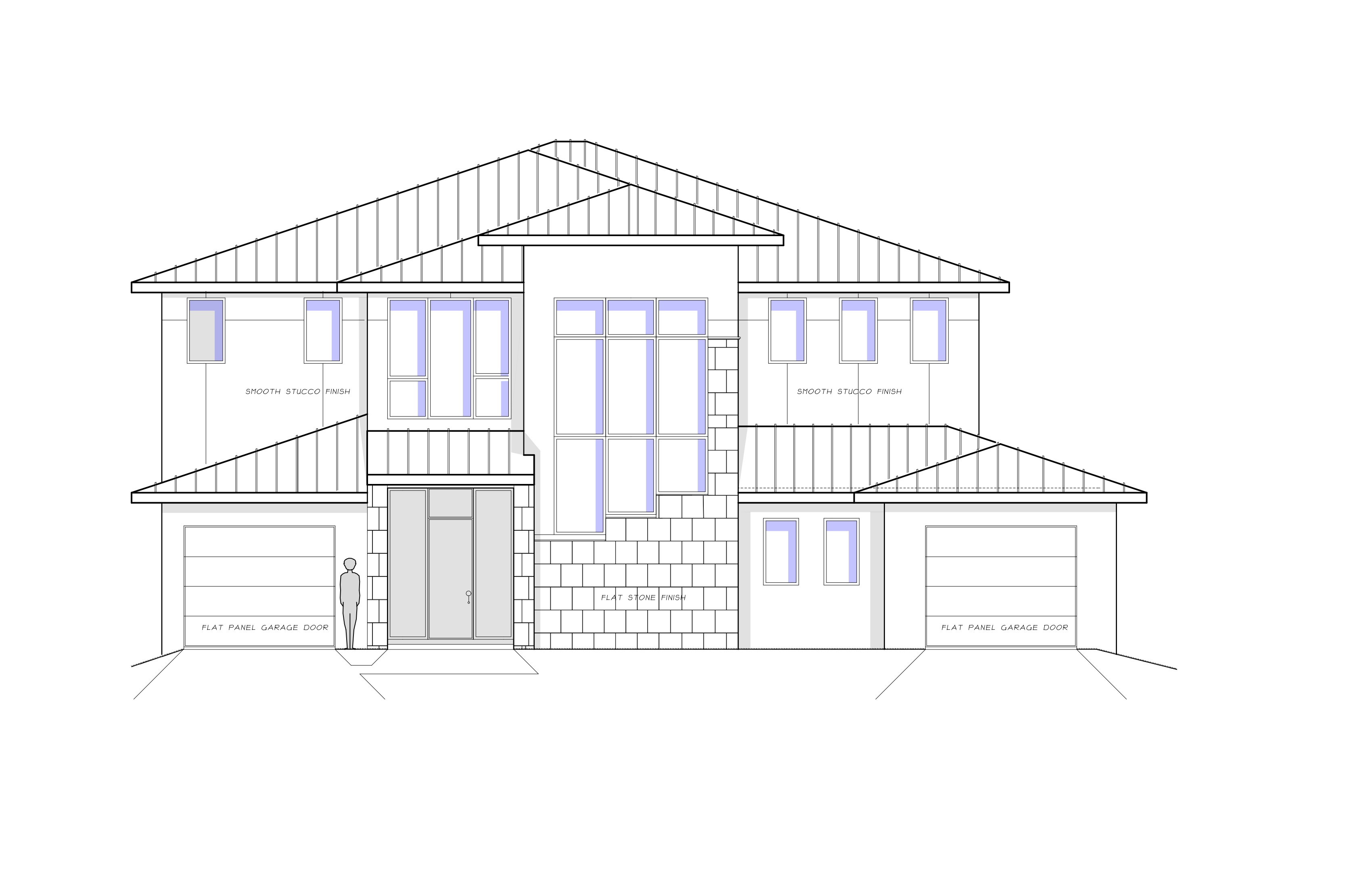 clean modern elevation dark gray 1 3 4 standing seam metal roof light gray smooth stucco walls white window frames white fascia and soffit white flat panel garage doors each side of home garage and entry in same line tropical landscape grass yard dappled gray large paver driveway and walk to entry blue sky with clouds