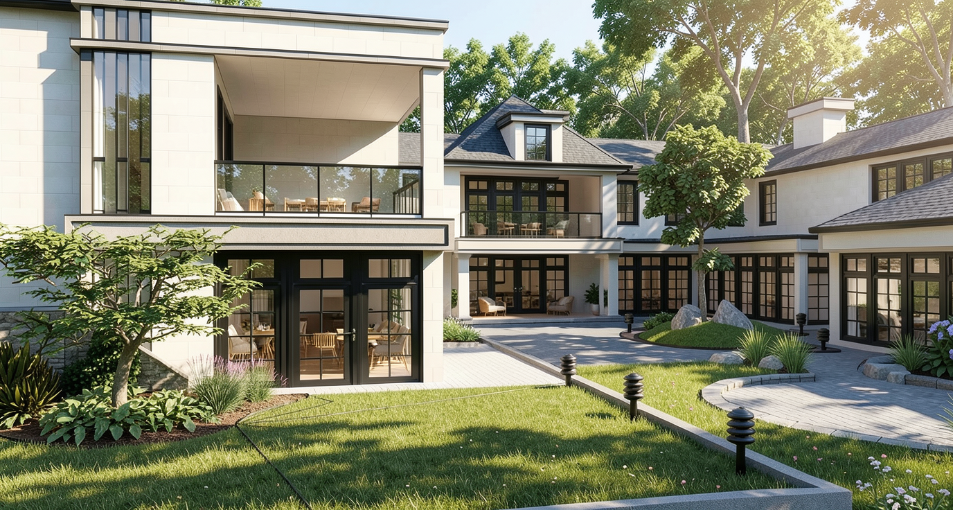 summer time almost noon sharp lights colors have black frames trees more realistic at the back ground show trees inside the buildings show furniture the windows are darker