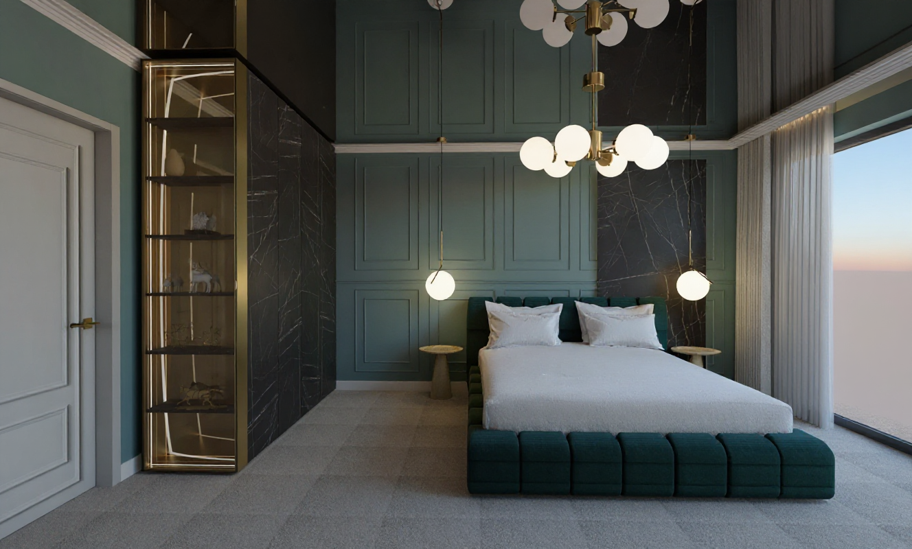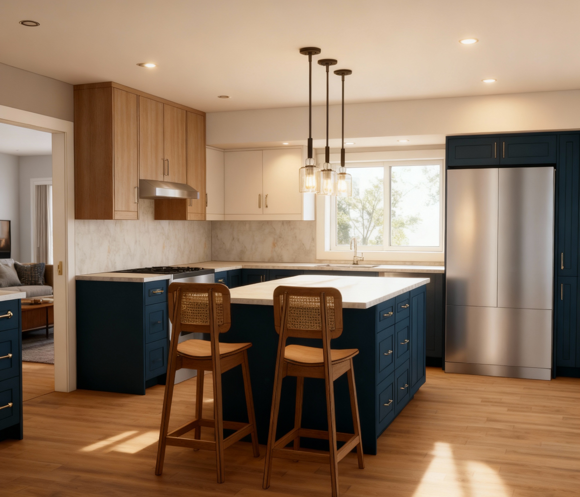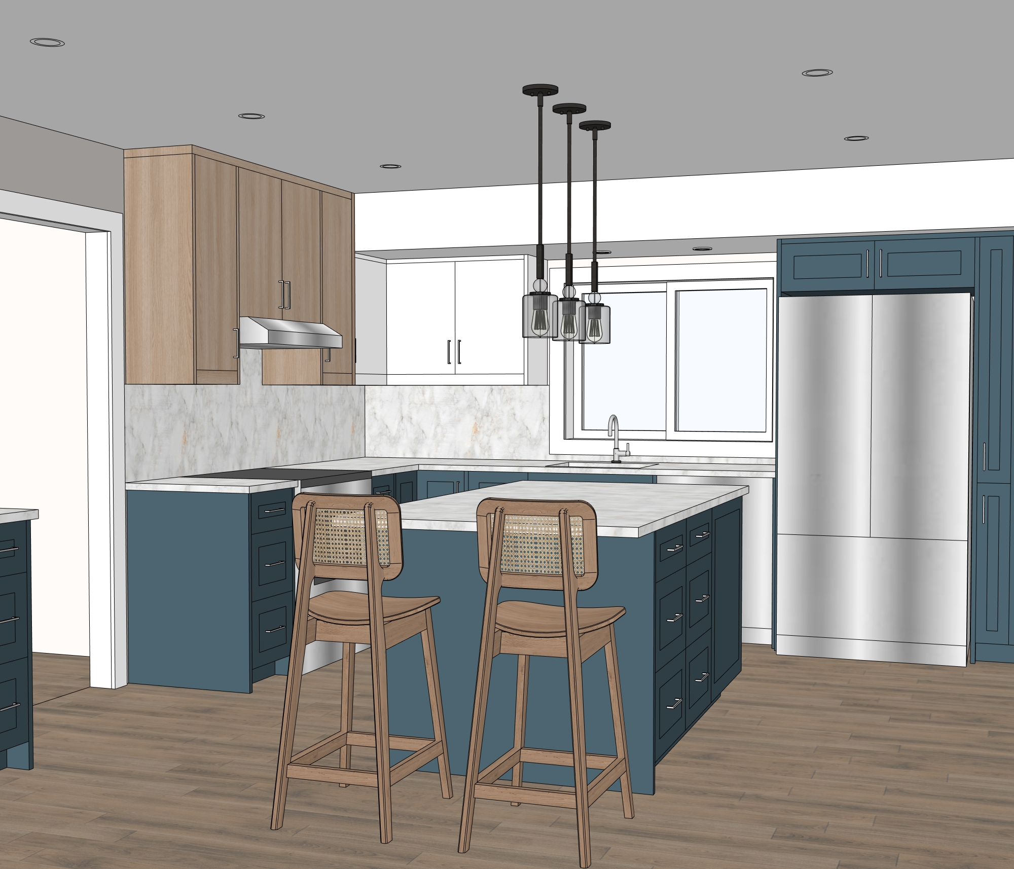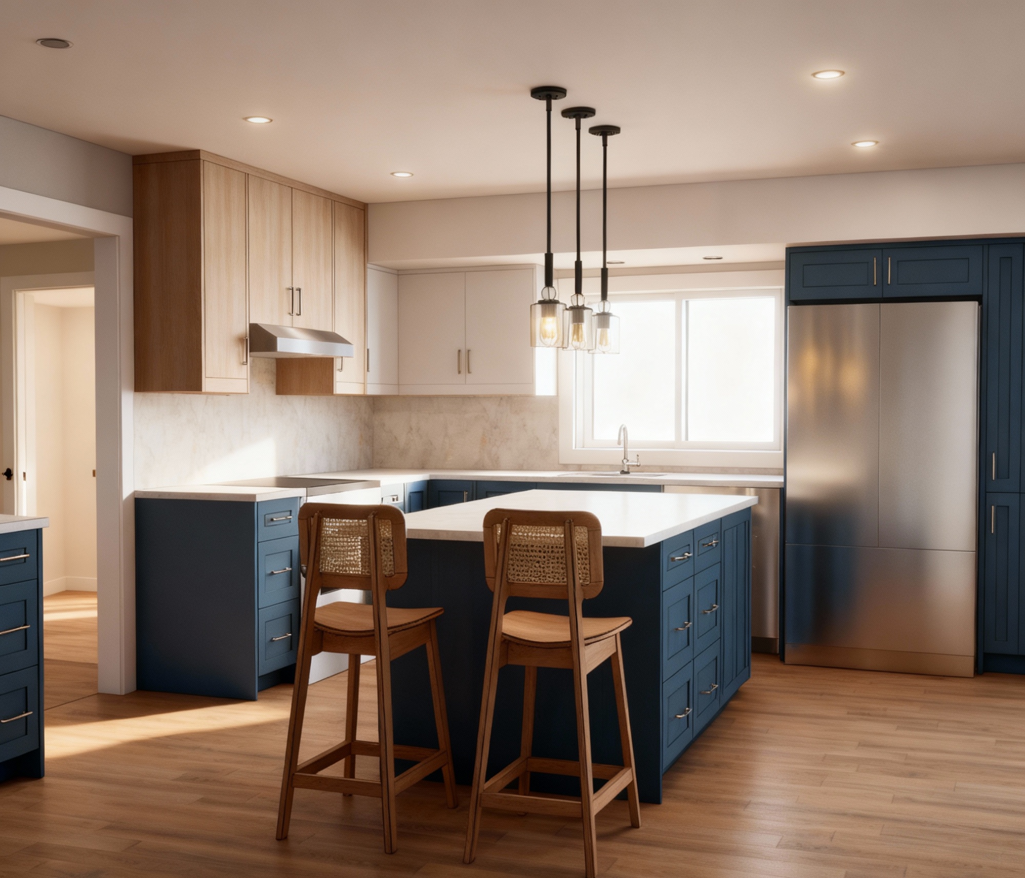 render the scene in a bright modern style with light coming in from the windows the potlights and pendant lights are lit up through the doorway on the left is the wall of a living space the cabinet handles are brushed nickel handles with a simple modern style the blue cabinets have shaker style doors include stainless steel appliances add a cutting board on the island counter with sliced apple