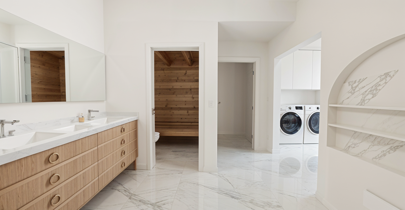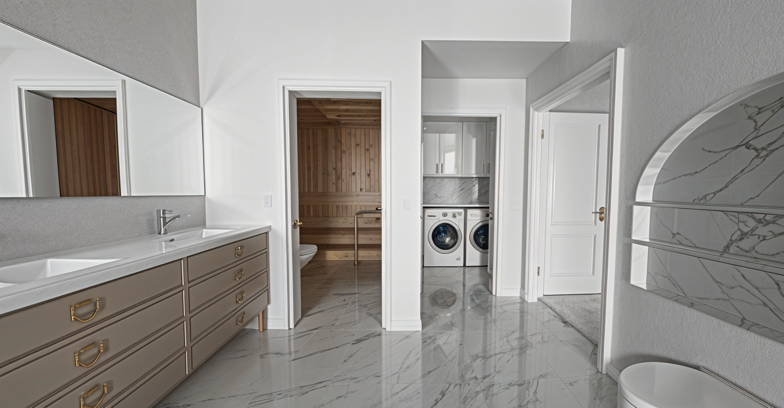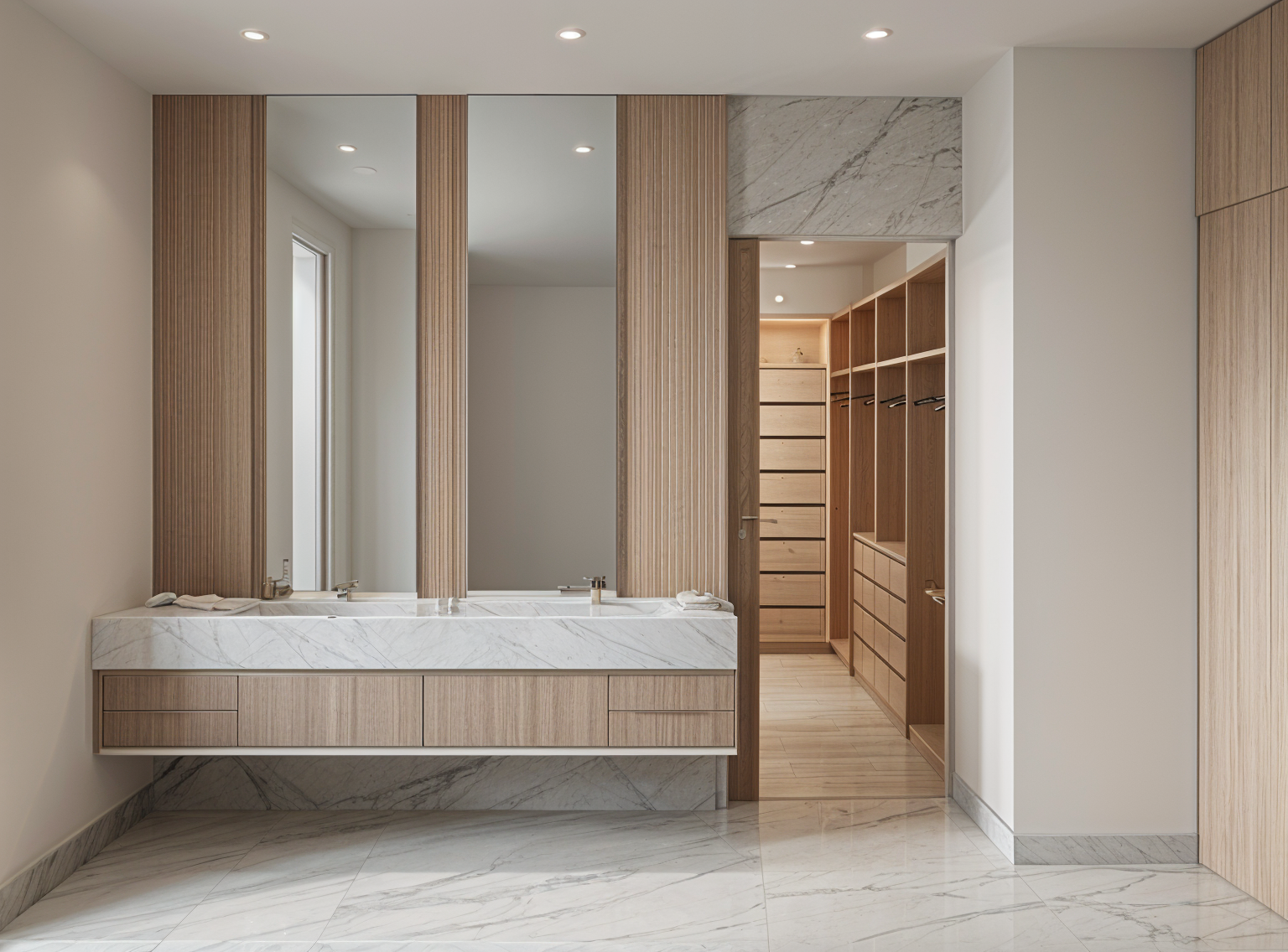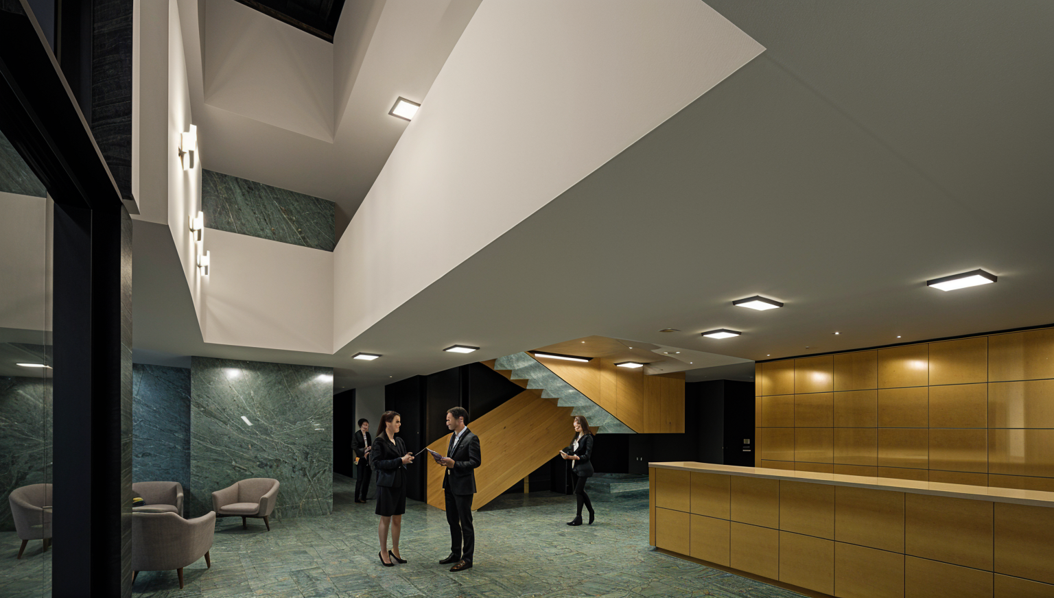 render the scene in a bright modern style with light coming in from the windows the potlights and pendant lights are lit up through the doorway on the left is the wall of a living space the cabinet handles are brushed nickel handles with a simple modern style the blue cabinets have shaker style doors include stainless steel appliances add a cutting board on the island counter with sliced apple