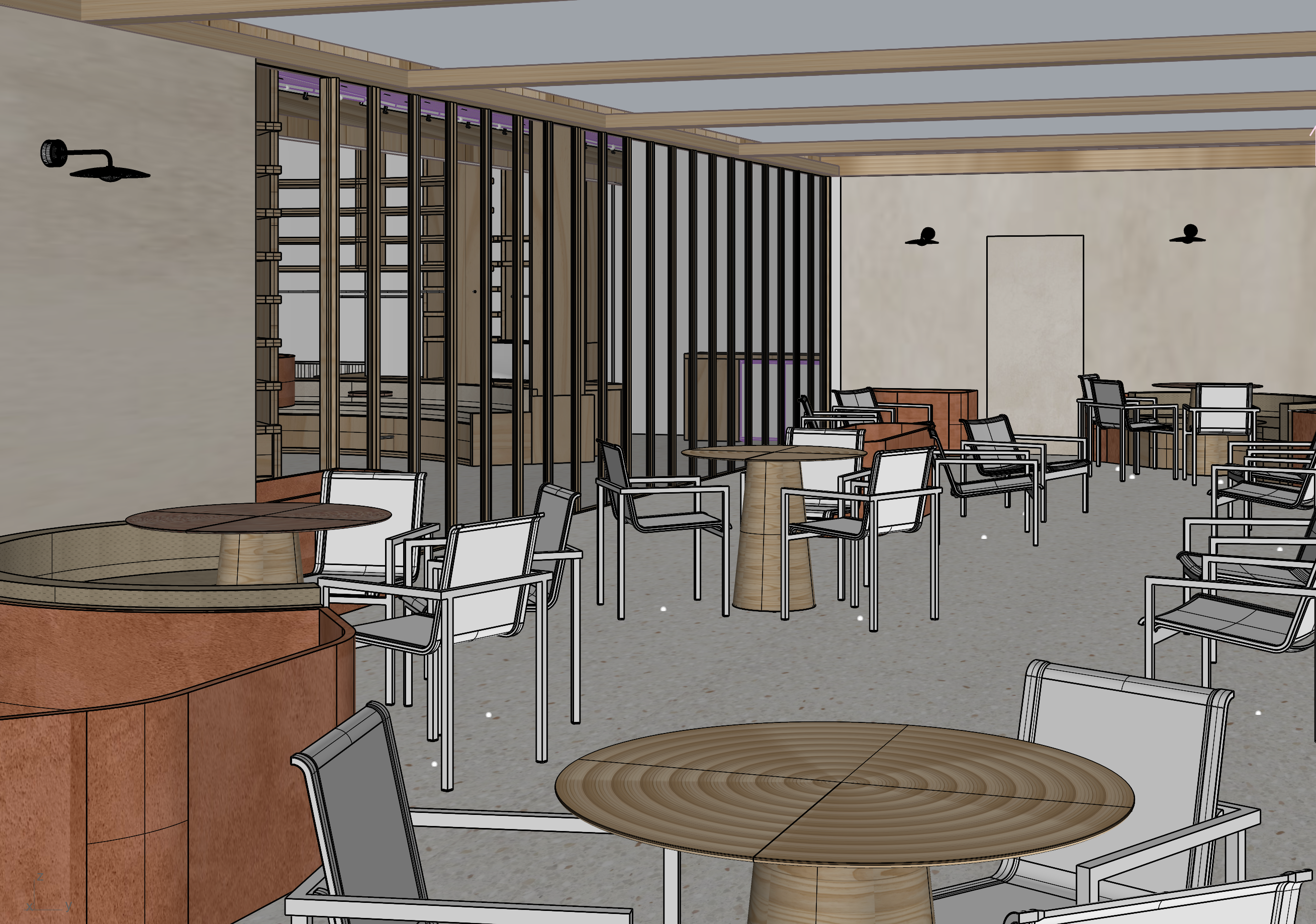 this is an rooftop terrace the floor is light terrazzo the red is bespoke terracotta planters put plants in these the solid walls are light beige stucco there are lamps hanging on the walls shining light downwards there is a glazed operable wall dividing the inside and outdoor terrace can you open this up the structure above the terrace is holding a flexible textile shading system make the shading be pulled back towards the left wall so it is not fully covering the terrace but you can still se that it is there all the wood is pine