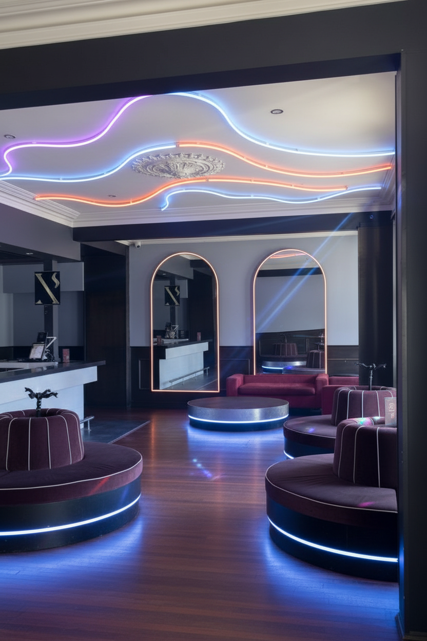 exterior shot create an image of an elegantly curved hallway with multiple arches outlined in pink and purple and lime grren neon lights the arches recede into the distance creating depth and perspective the walls are a rich dark crimson enhancing the luxurious atmosphere deep wooden floor boards the overall ambiance is opulent and inviting casting soft vibrant smoky shadows on the dark polished floor