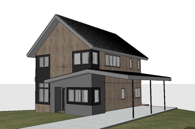 photorealistic rendering of modern scandinavian house with landscaped yard abundant trees and and distant rolling green hills in the background make the house closely resemble a raccoon s face