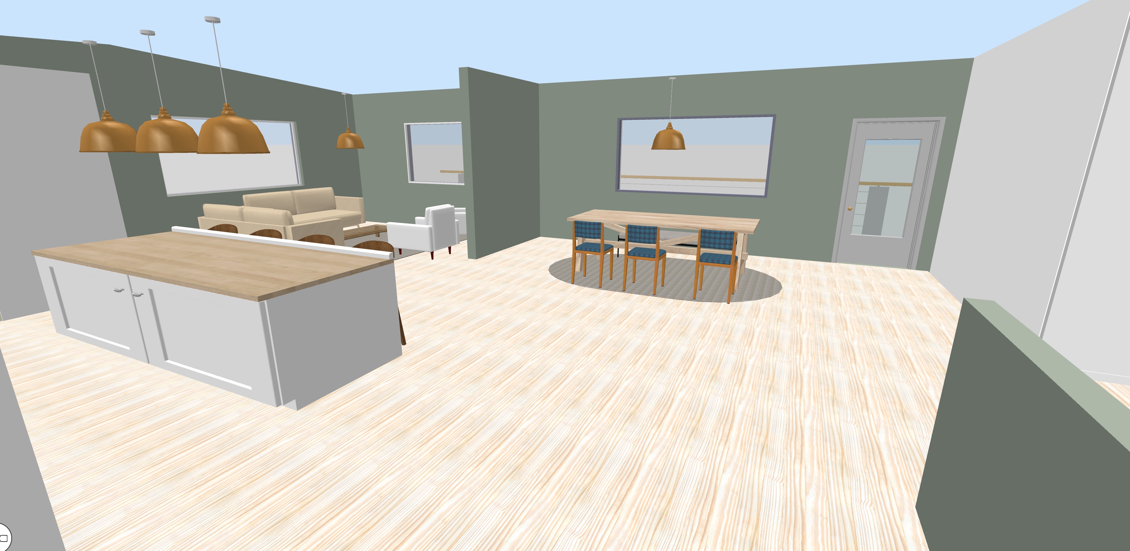 the wall you see straight across from view where dining table is a view of kachemak bay at a distance the sun rises from the west side of the image place an appropriate sized adult sitting at the dining table