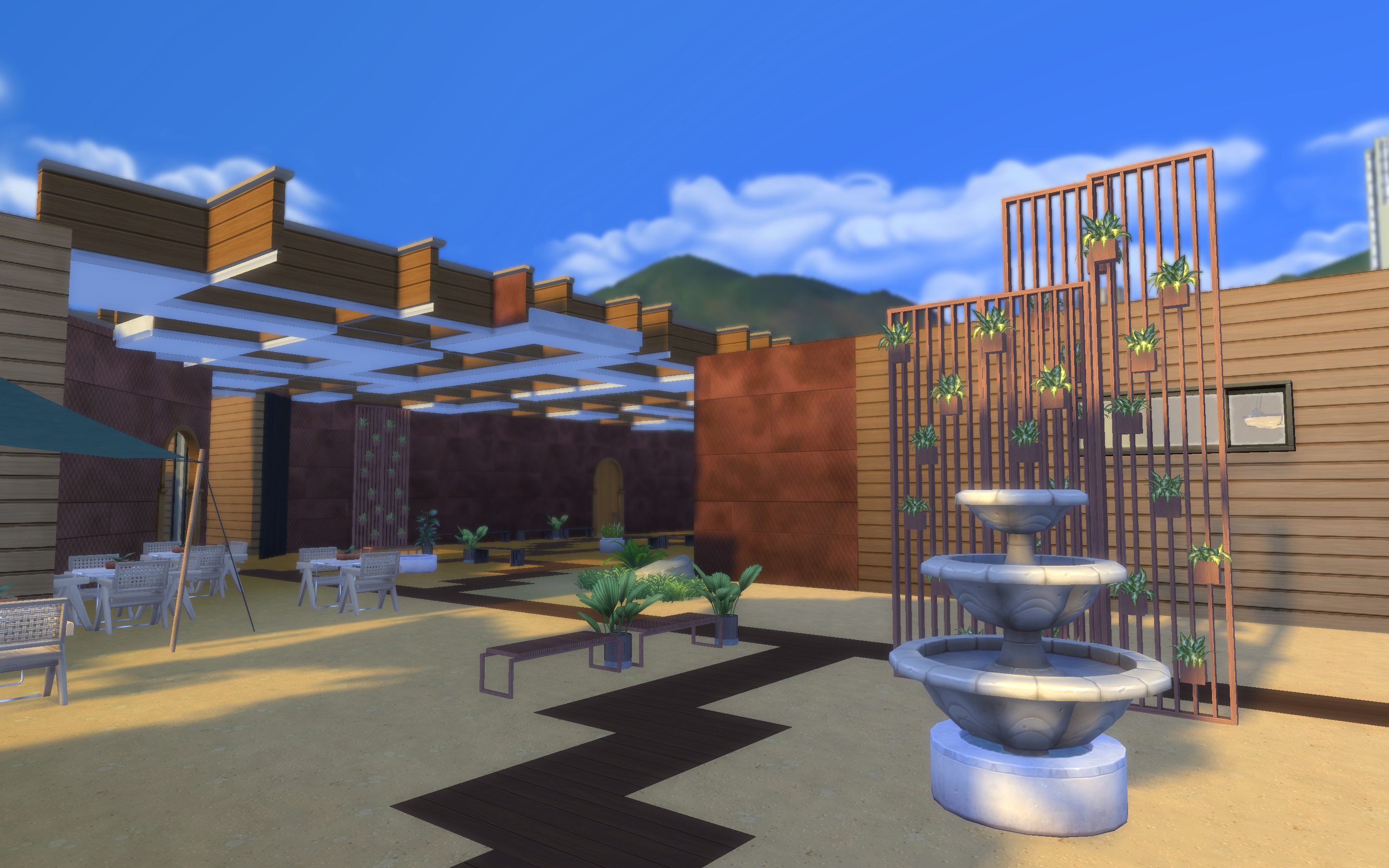 sustainable design exterior shot sustainable beautiful garden there are lot of wooden pathways between the wooden corten small box buildings there are plants and benches the ground is mostly gravel and sand there is a fountain and also roof with holes make it 100 accurate to the photo do not change nothing architecture