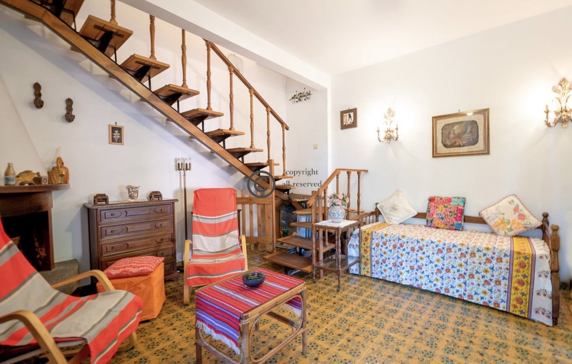 create a neutral ambient with tones of beige and blue and a boucle a sofa change the stairs and all the chairs