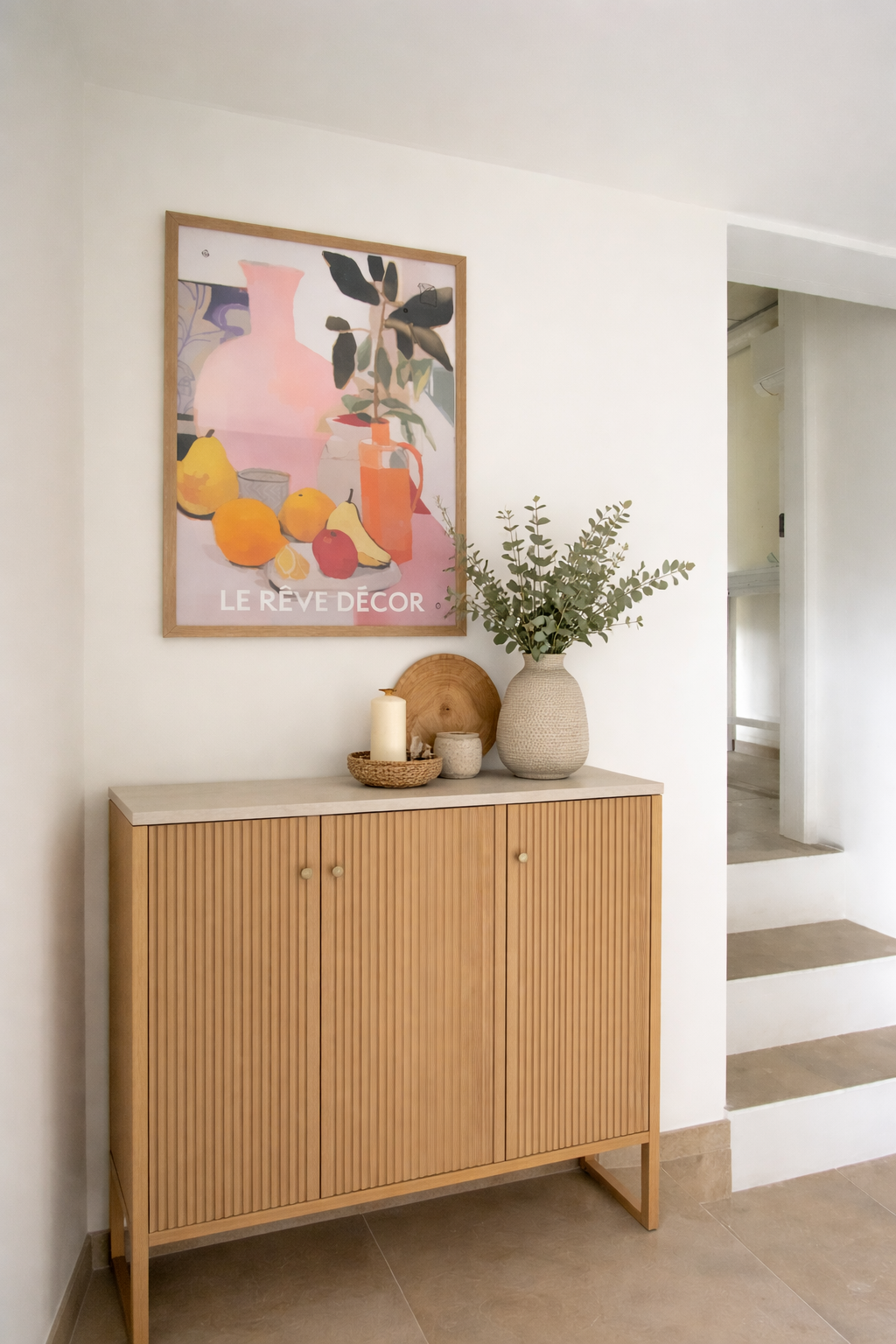 this is a real interior photo with a framed artwork on a white wall and a cabinet below it preserve the entire scene exactly as it is including the wall artwork lighting and perspective the decorative objects on top of the cabinet vase tray decor replace only the existing cabinet with a simple white cabinet with the following characteristics matte white finish clean minimal design two front doors with a small round knob slightly raised on side panels open space at the bottom no full base modern scandinavian style keep the same size position and proportions as the original cabinet place the existing decorative items naturally on top of the new cabinet maintaining a balanced composition ensure lighting shadows and perspective match perfectly so the result looks realistic do not move the artwork change wall or floor add new furniture change layout or camera angle the final image should look like a real photograph with a clean modern white cabinet replacing the previous one