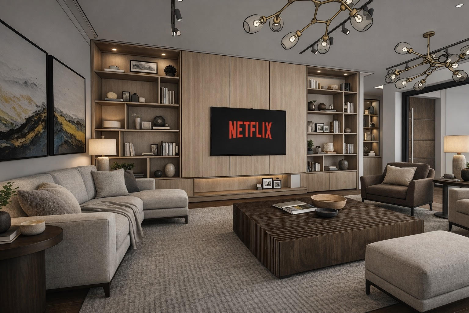 a modern luxurious kitchen with a serene and sophisticated atmosphere the room features sleek grey oak cabinetry with flutted travertine curved cabinets and a large island centerpiece made natural traavertine romano the walls are clad in a soft cashmere hue with panelling complementing the cabinetry appliances are seamlessly integrated adding a touch of contrast overhead lighting is warm and ambient creating a cozy yet refined ambiance the flooring is parquet enhancing the airy feel of the space sparse greenery adds a hint of freshness while maintaining the minimalistic and clean design outdoor light from the right hand side window view is of luxury villa style