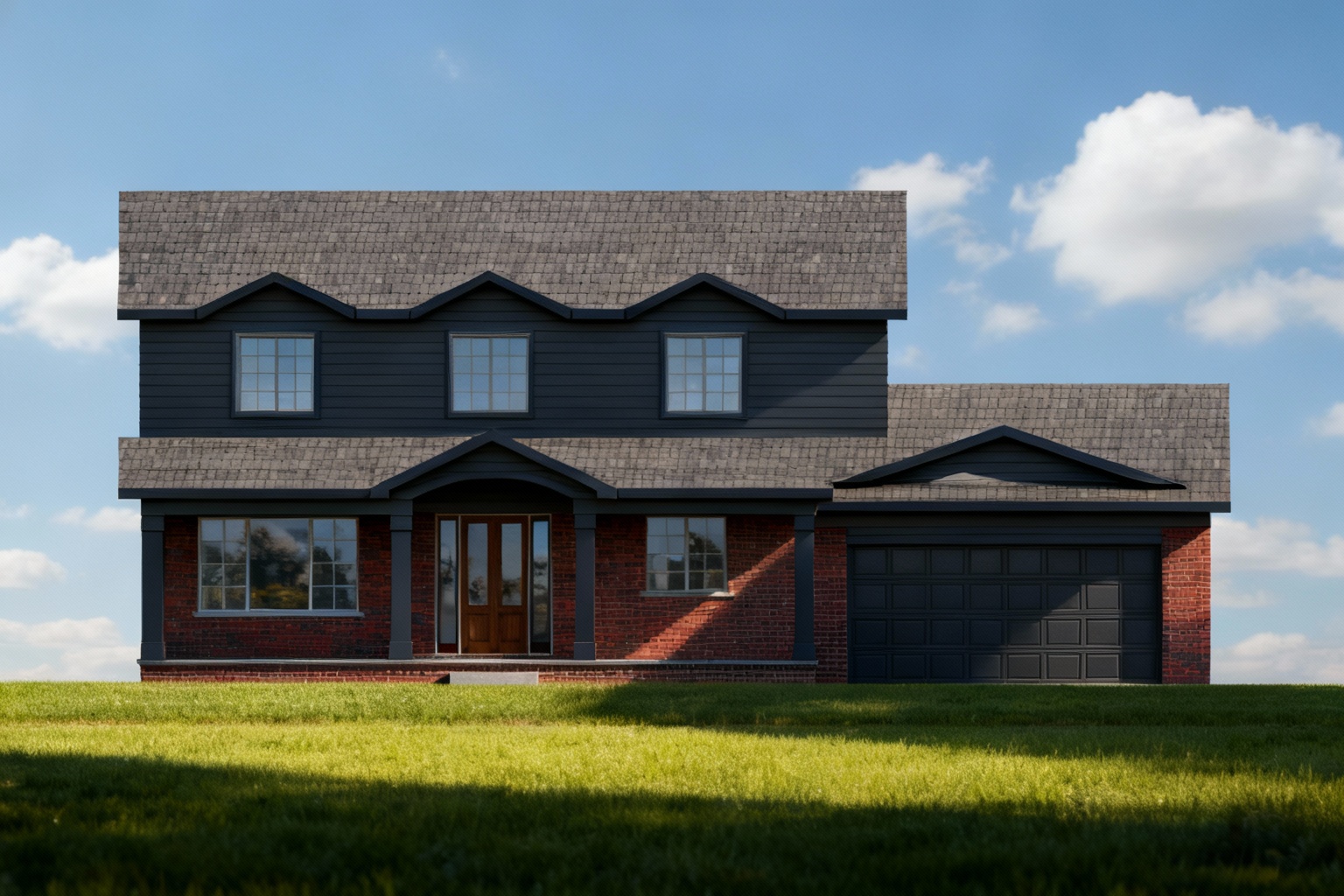 exterior shot architecture have dark gray siding 3d rendering with dark gray trim and column mixe brick with red and dark red please have soft shade and the picture more realistic and bright move shade to other side and use dack gray for garage door use more realistic glass window for second floor too noon sun shade