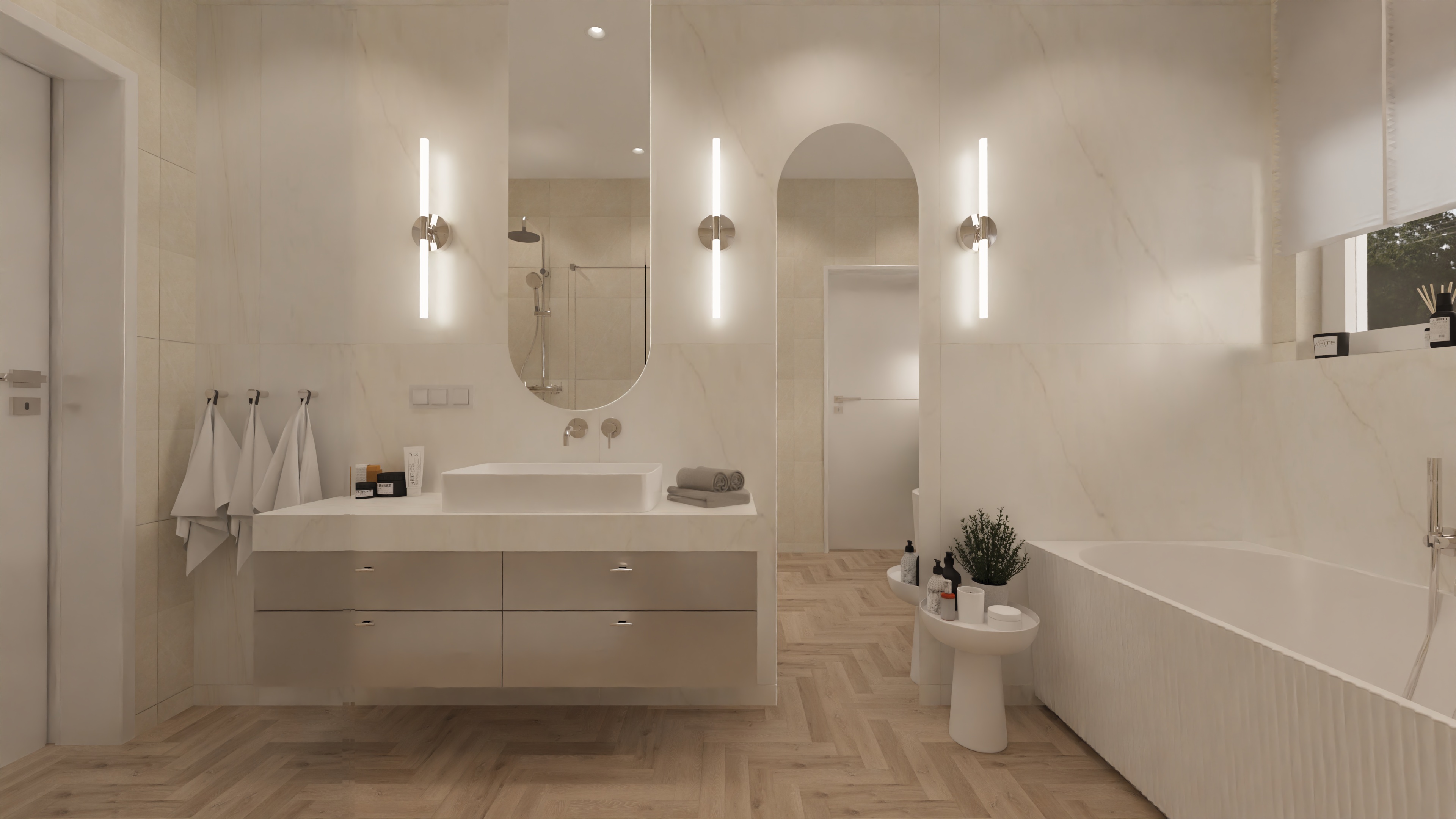 transform this picture into a realistic interior visualization with natural light keep the camera angle keep the original materials and textures make it an ultradetailed view with global illumination and photo based rendering materials