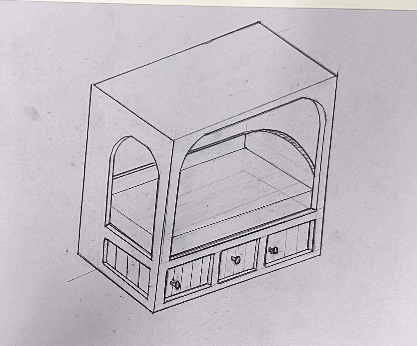 change the image to a enclosed bed frame with a mattress in the centre to the right of the image there are three recessed panels that are draws above the draws there is a arch with the same curvature as the one to the right at the back of the bed frame there is a rounded head board