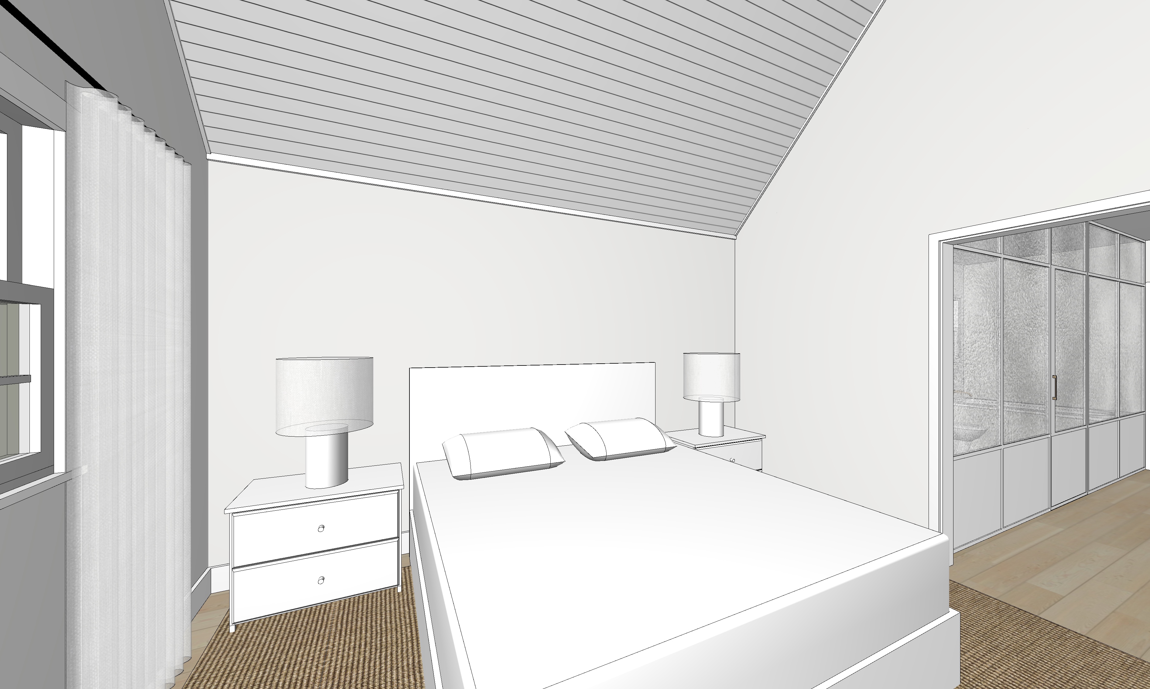 a cozy and modern bedroom with a vaulted ceiling the walls are painted in white while the ceiling features white wooden planks the bed is adorned with white linens and pillows situated between two oak nightstands each nightstand holds a simple elegant lamp with a creamy beige shade the floor is covered with a warm textured sisal area rug a large window with sheer white curtains filters in soft natural light creating a peaceful and serene atmosphere the wooden floor has a light oak finish complementing the room s neutral tones the ambiance is calm and inviting perfect for relaxation beyond is a bathroom screened by a wall of textured glass in a white metal frame