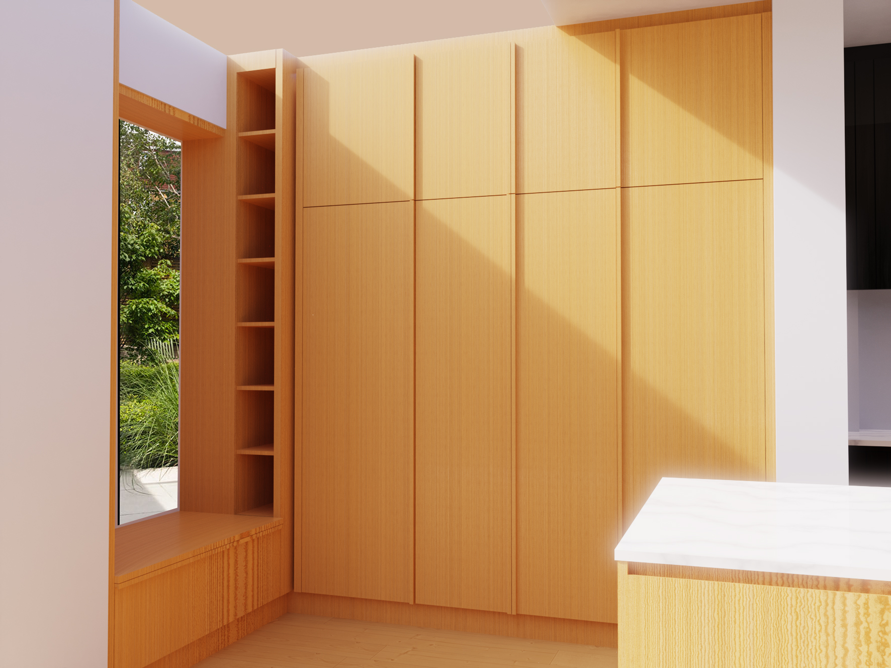 a light white oak kitchen marble counters and full height splashback add some books into the island shelf and some simple modern kitchen ceramics and glassware