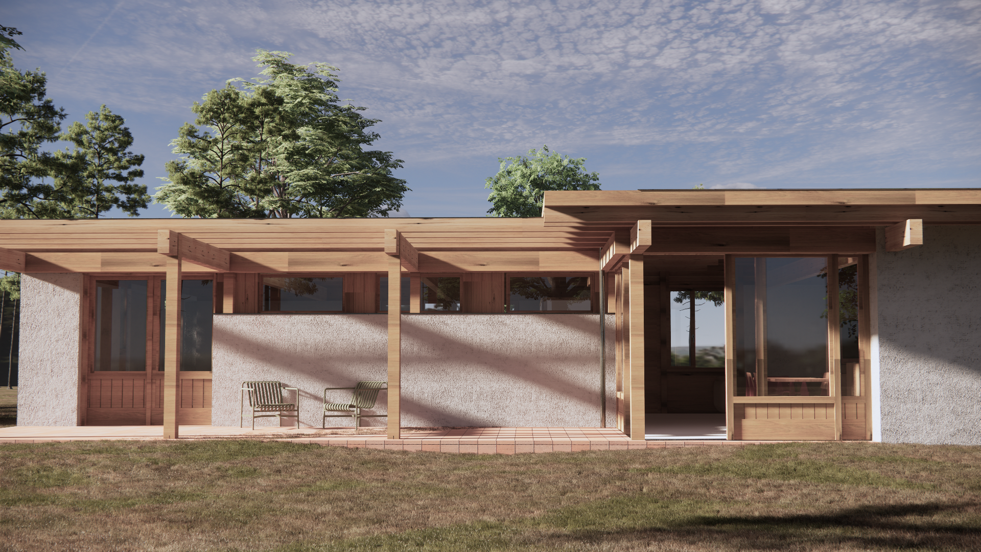 render a photorealistic 3d perspective of this house reference the current material style just enhance them concrete walls pine wood beams pine wood windows red stone floor eep model geometry the same windows doors roof walls make a lush vegetation that looks french oceanside do not change the view only enhance the current materials and make the landscape nicer vegetation detailed textures in the wood siding and glass reflections and a vibrant clear sky with light atmospheric depth render in hyper realistic architectural visualization quality 8k resolution