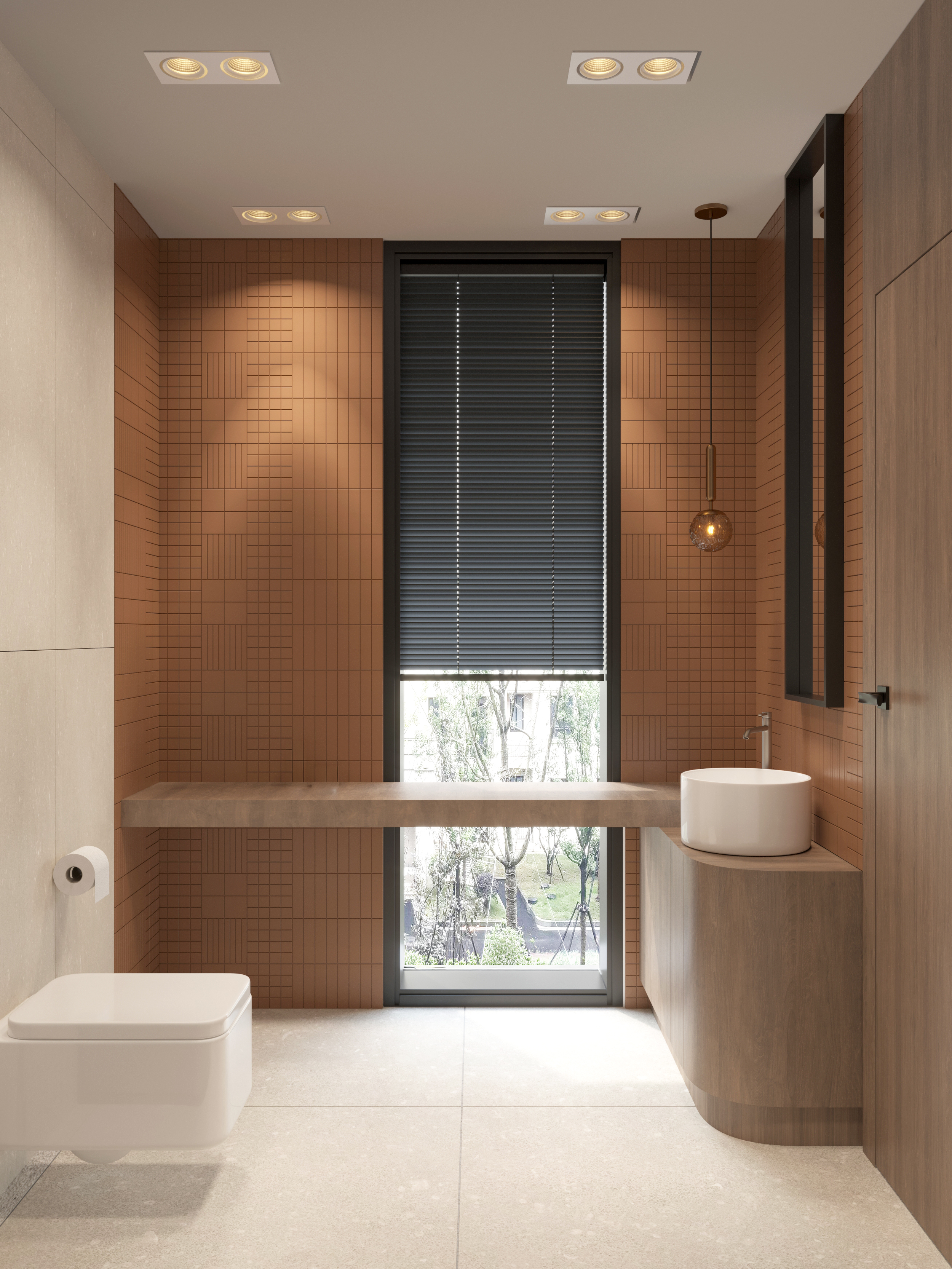 modern minimalist bathroom interior terracotta colored tiles on the wall near the window and behind the sink the floor and the wall with the toilet bowl are finished with neutral beige tiles featuring a subtle texture enhance the overall visualization quality increase the realism of materials and textures and improve the natural daylight lighting for a more photorealistic result maintain accurate light reflections soft shadows and realistic surface details do not change the layout proportions or shape of any fixtures or architectural elements