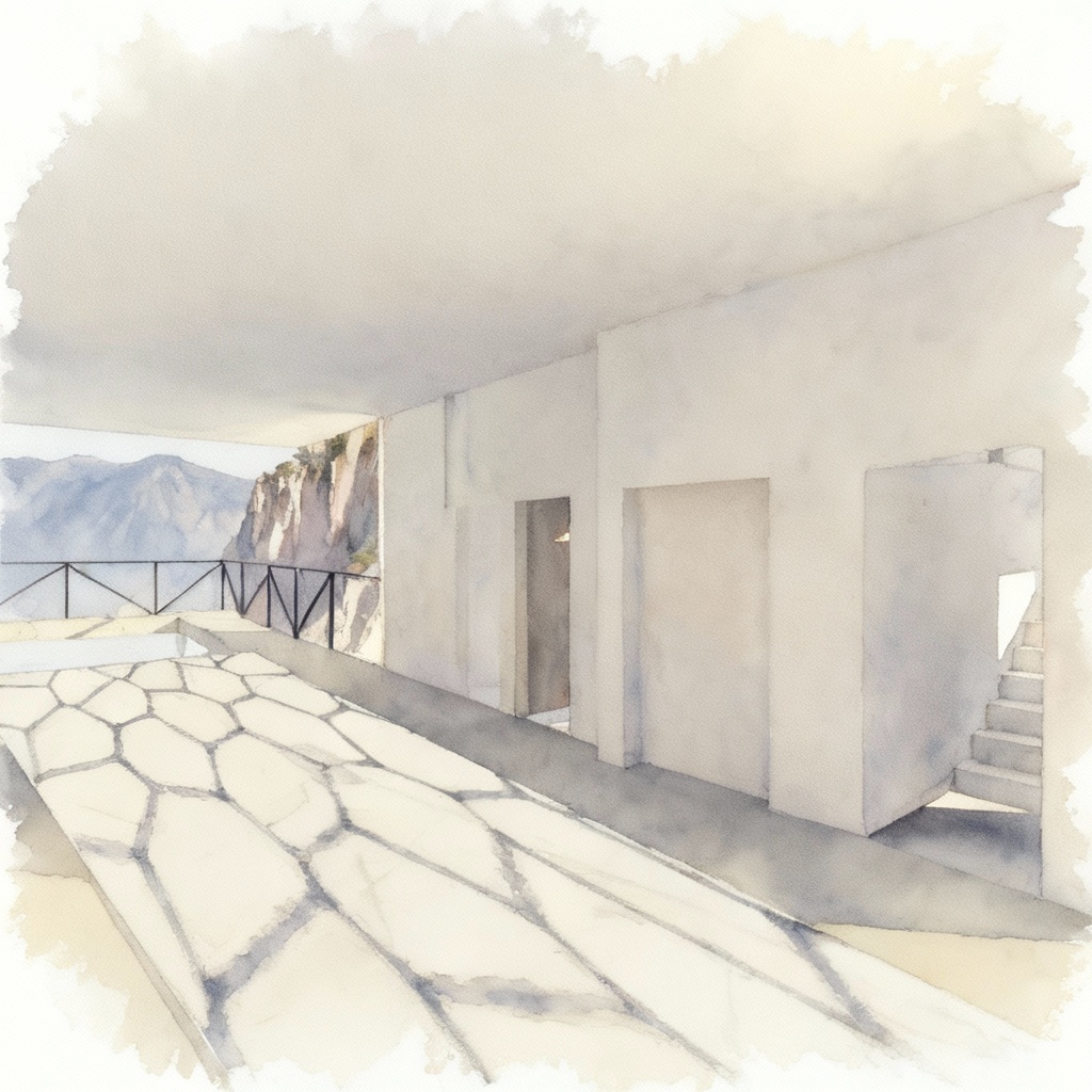 stone path have the end looking out to a mountain cliff view while maintaining original geometry make it look watercolor and fades out to white towards the border