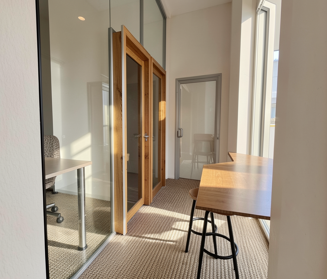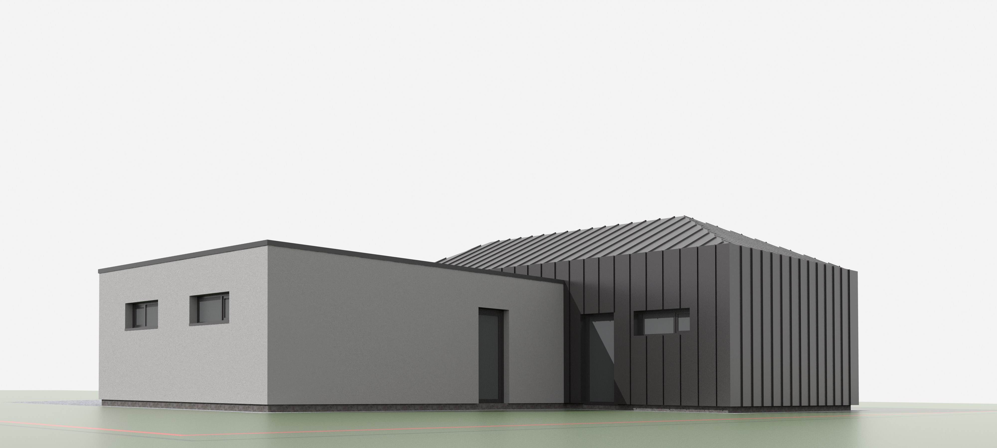 render a modern architectural building with a sleek linear design feature a structure with a charcoal gray metal roof and facade with segments of light grey plaster creating a minimalist aesthetic the roof and walls reflect a glossy black that contrasts with the light gray paving and gravel driveway the area around the building is covered in lush green grass cloudy summer sky with fields and shrubs on the horrizon and metal dark grey fence behind the building set the scene in a clear bright atmosphere with soft sunlight casting gentle shadows enhancing the building s modern elegance make windows transparent