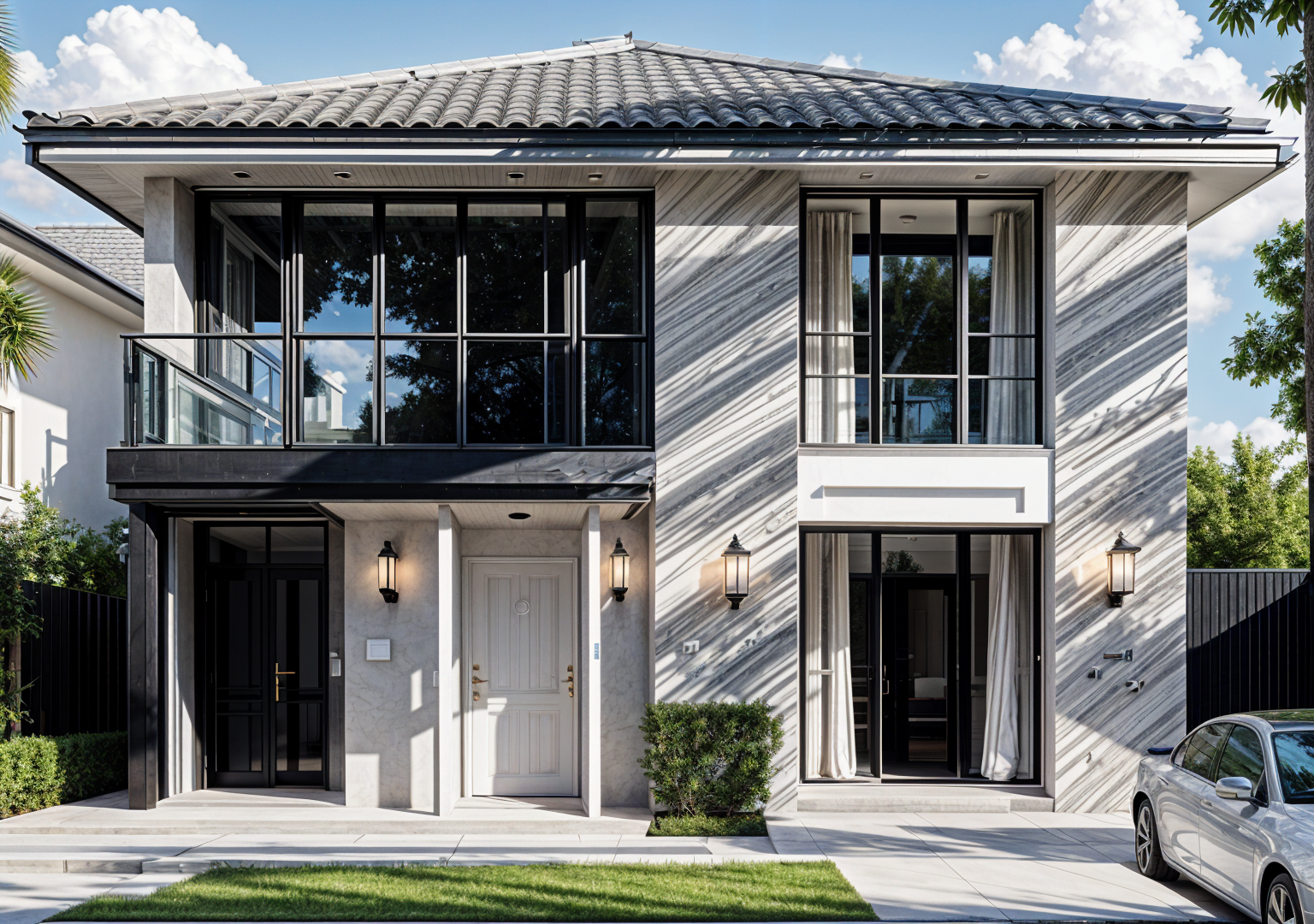 modern kitchen design featuring sleek gray cabinets and a contrasting marble island with deep blue and white veining the countertops and backsplash enhance the sophisticated atmosphere soft beige flooring complements the muted color palette stainless steel appliances add a contemporary touch ambient lighting creates a warm and inviting atmosphere with subtle reflections elegant minimalist barstools nearby emphasizing the modern elegance of the space