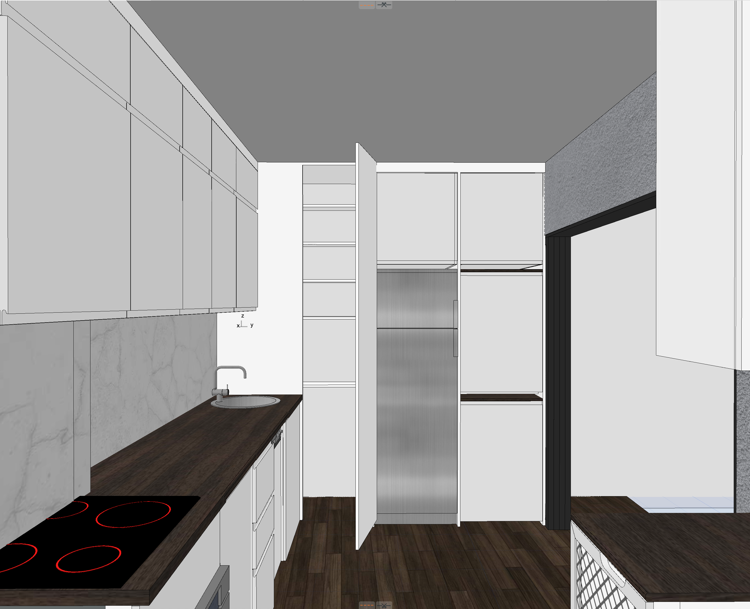 modern narrow kitchen interior realistic proportions frontal perspective at the back si a small corner walk in pantry that has its door open kitchen furniture with mdf doors in light wood finish light oak or maple tone matte flat panel handleless design for a clean minimalist look countertop made of polished black marble with fine white veining creating strong contrast with the light cabinetry left side linear kitchen with built in oven and cooktop integrated sink continuous countertop and upper cabinets aligned vertically and horizontally back wall lower cabinets under the onyx panel with matching light wood mdf fronts right side tall unit with stainless steel refrigerator floor finished with beige ceramic tiles subtle texture medium size warm tone to balance the dark countertop and onyx wall walls in smooth light neutral finish off white or very light grey lighting warm ambient lighting combined with led backlighting behind the onyx slab and under cabinet lighting to emphasize materials and depth style modern minimalist warm contemporary balanced contrast between light wood dark stone and soft neutral surfaces