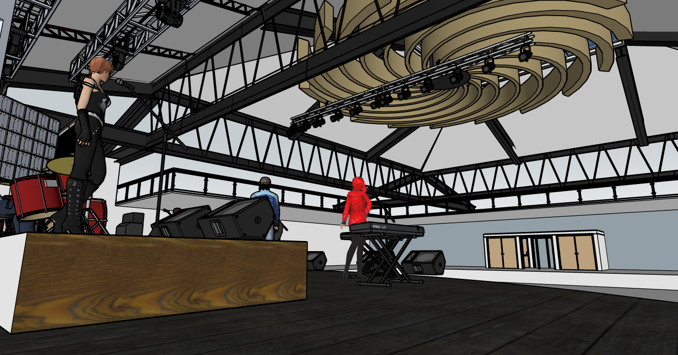 night shot upscale nightclub interior at night point of view from the stage looking out toward the house preserve all visible architecture and geometry from this angle exposed steel trusses balcony fronts rear wall and the sculptural wooden ceiling centerpiece polished concrete floor with subtle reflections maintain the high end modern exclusive atmosphere from the previous render add balanced ambient architectural lighting so the room is visible warm cove lighting along balcony edges and architectural lines and focused uplights on the wooden spiral ceiling feature so it glows as a central design element keep dramatic stage lighting behind and above camera casting soft illumination into the audience area populate the room with upscale lounge seating low profile sofas cocktail tables bar height seating along balcony fronts all in luxurious materials like leather velvet brushed metal and dark wood seat and stand an affluent well dressed audience in these areas facing the stage and engaged with the performance density medium not crowded audience posture relaxed and attentive no cheap furniture no clutter no plastic chairs lighting balance should allow the audience and architecture to be visible while still feeling like a live performance environment mood is modern premium energetic and social preserve original camera perspective instruments and visible stage elements in the foreground architecture