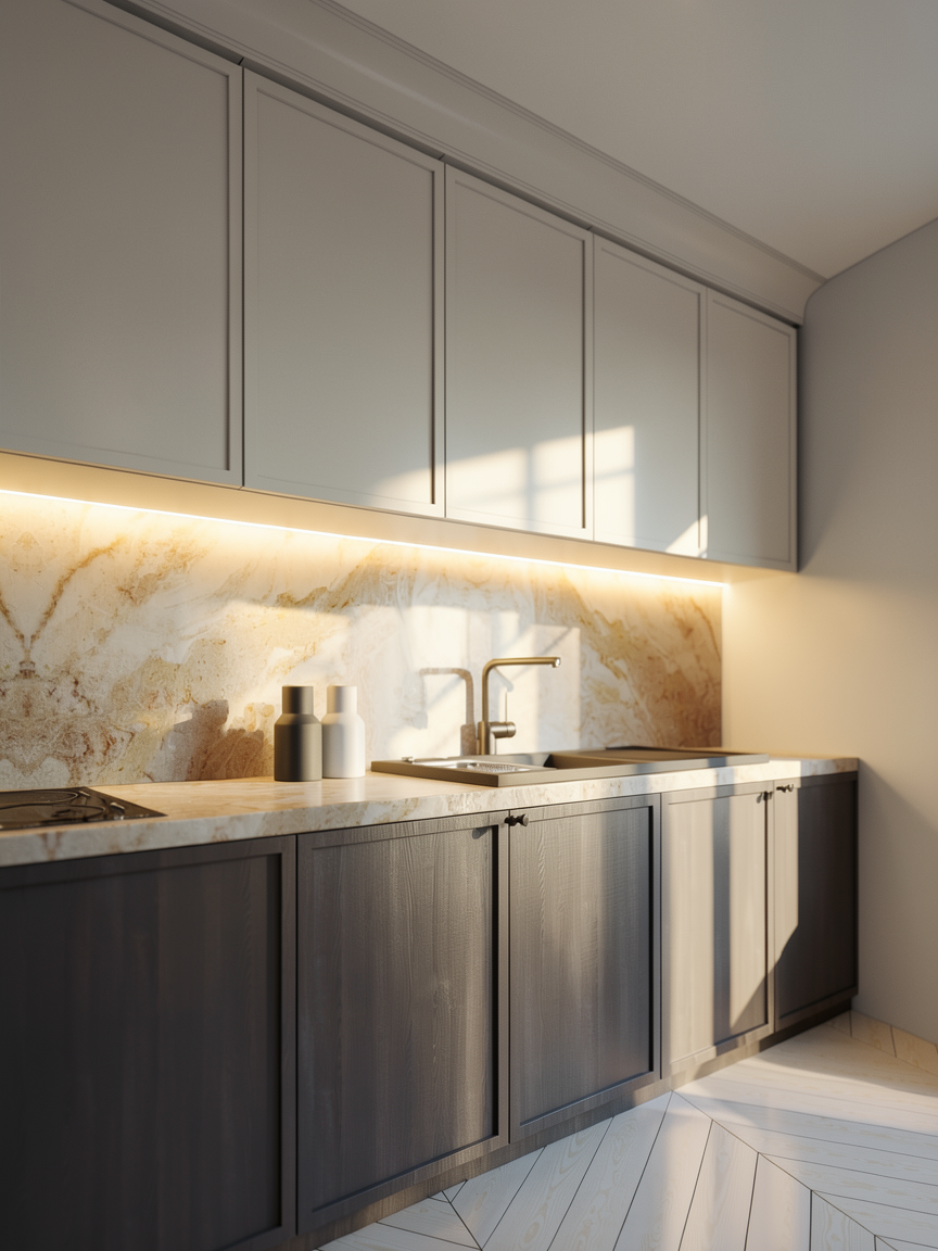 enhance the photo realistic texture and morning lighting set the interior lighting of the kitchen with soft artificial lighting setting under and upper of the cabinet enhance the realistic texture and dawn lighting with interior lighting turned on with soft light set the camera focus into f 35 focus on the table set