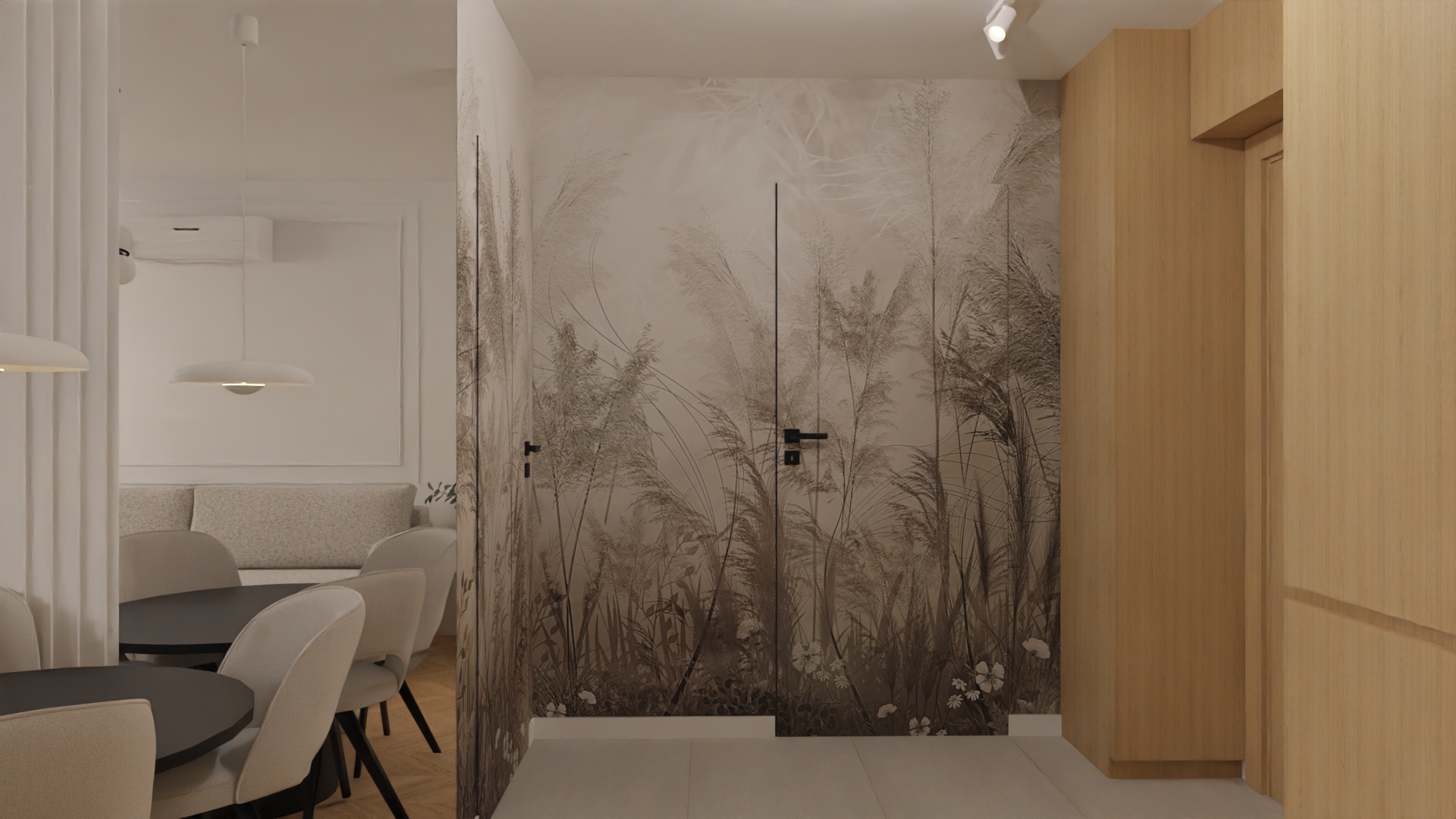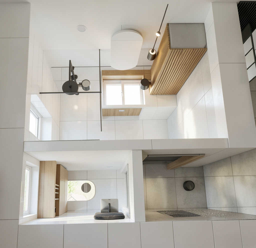 popraw jako na fotorealistyczna fotografi wn trza klasy premium projekt uk ad meble i materia y bez adnych zmian wzgl dem obrazu wej ciowego naturalne wiat o dzienne perfekcyjna ekspozycja naturalny balans bieli bardzo realistyczne materia y i detali zero zmian zero okien p ytki na pod odze w kolorze szaro be owym p yta meblowa w kolorze egger vincenza