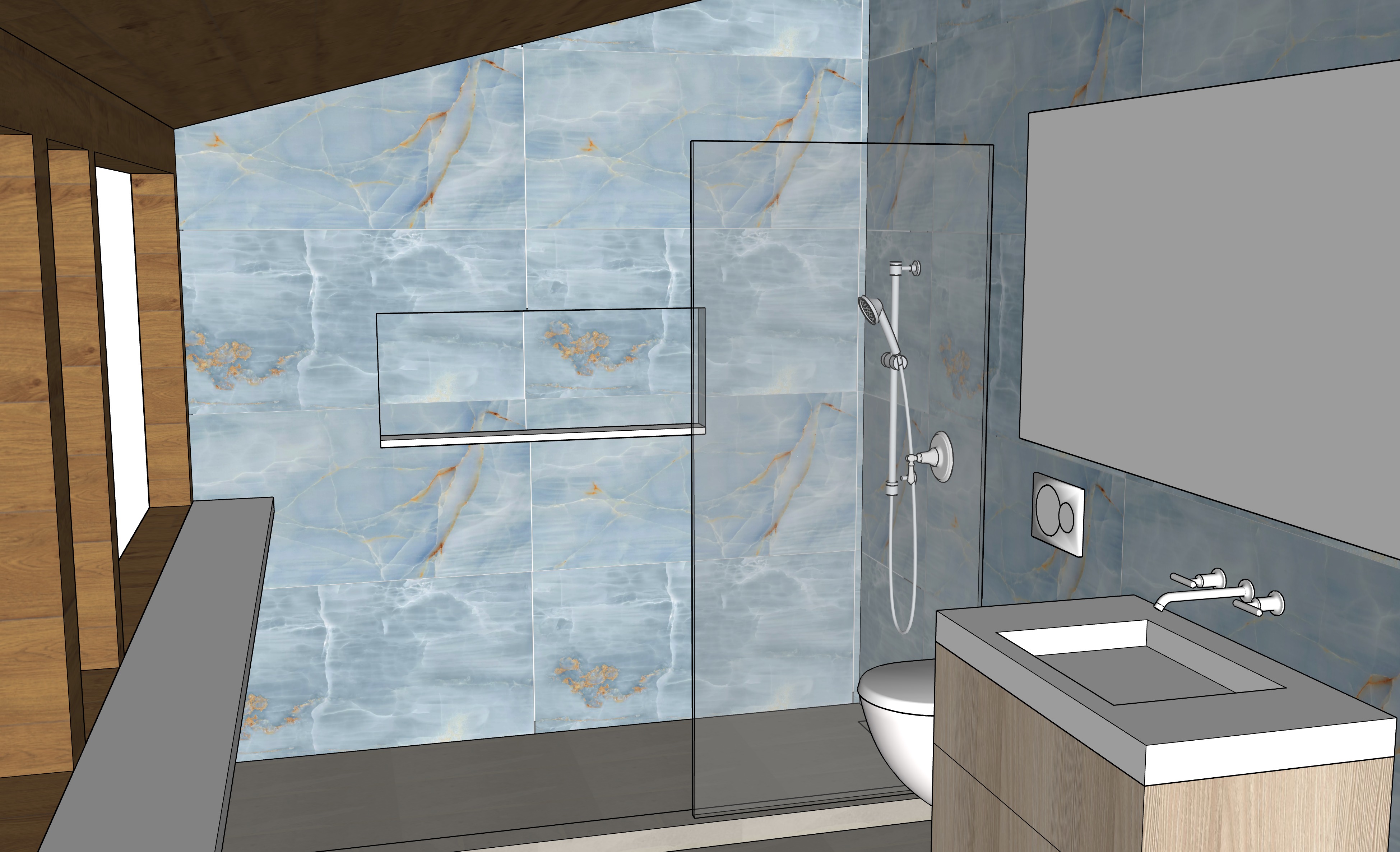 spa like atmosphere warm ambient lighting natural daylight from three windows led lighting around mirror and in shower niche keep slanted ceiling highlight light blue marble tile throughout same tile on flooring as well no window reflection on glass no center drain