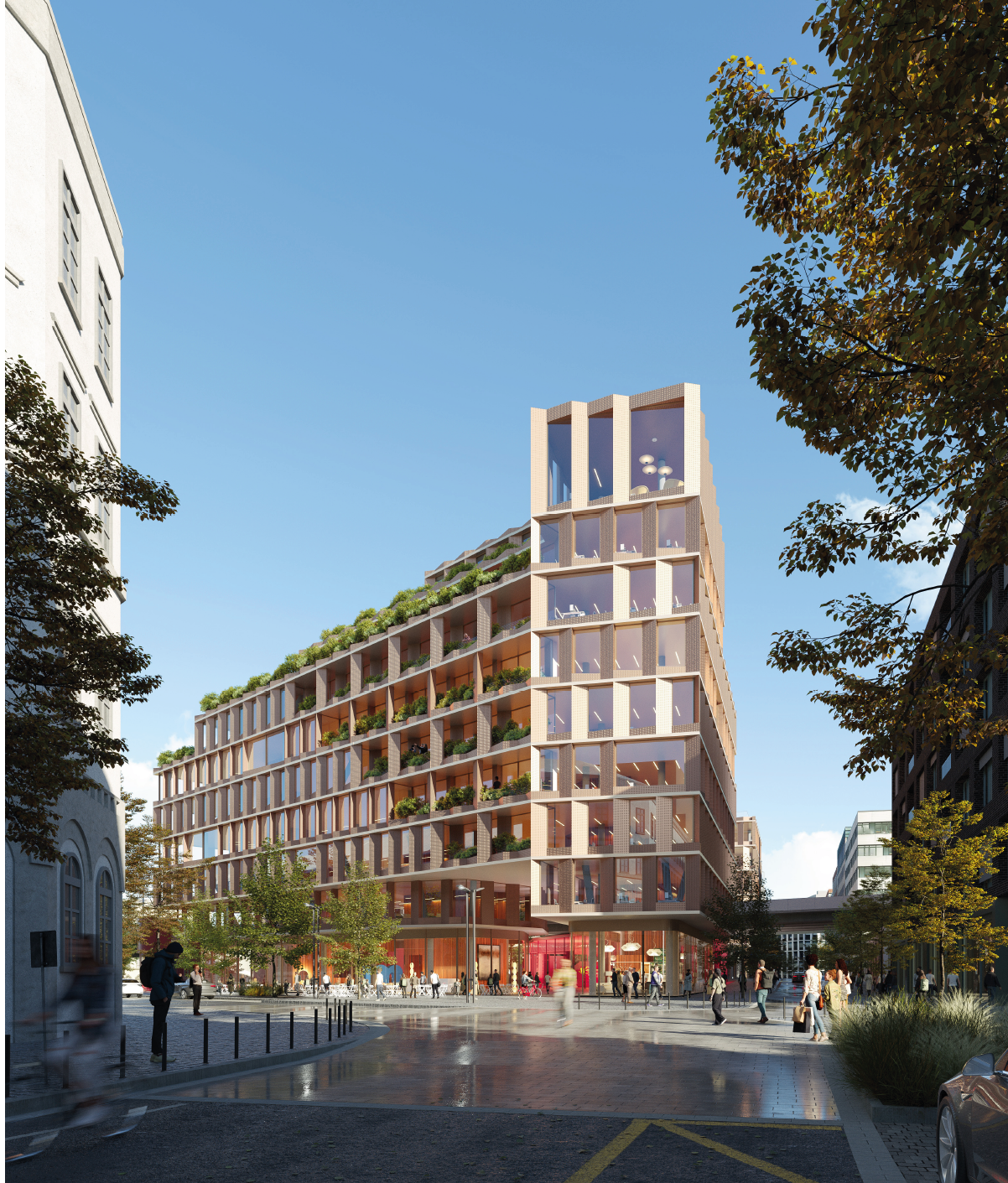 contemporary exterior shot atmospheric rendering of amazing contemporary office building in centre of prague award wining shot architecture