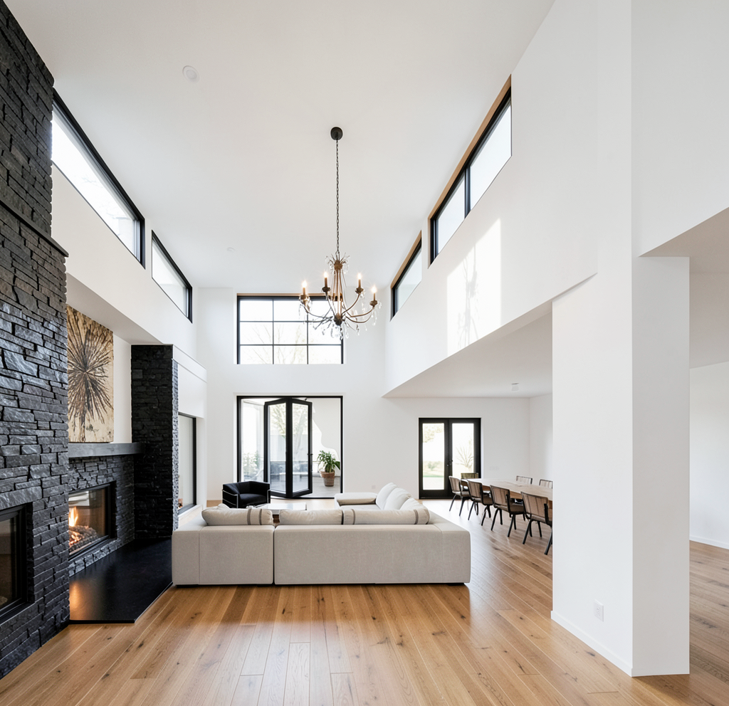 white interior walls black window and door frames wood flooring fireplace on the left side black stone finish chandelier from ceiling in the middle