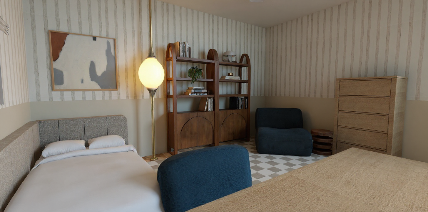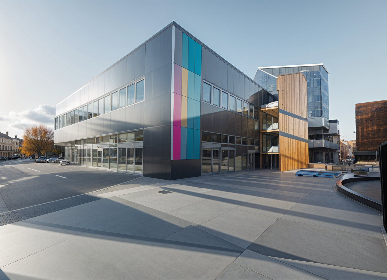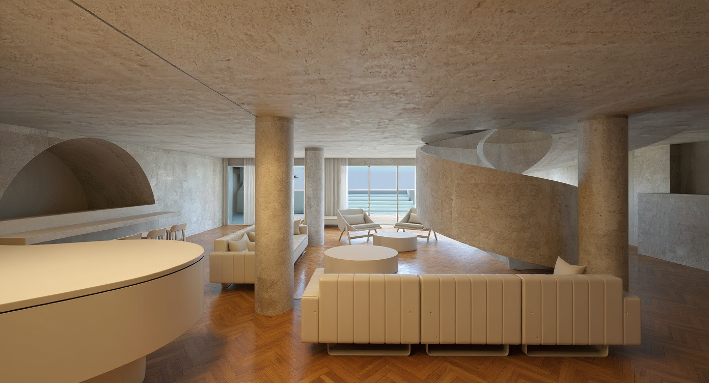 modernist interior shot industrial coworking space wooden details white walls concrete floor light ambience architecture