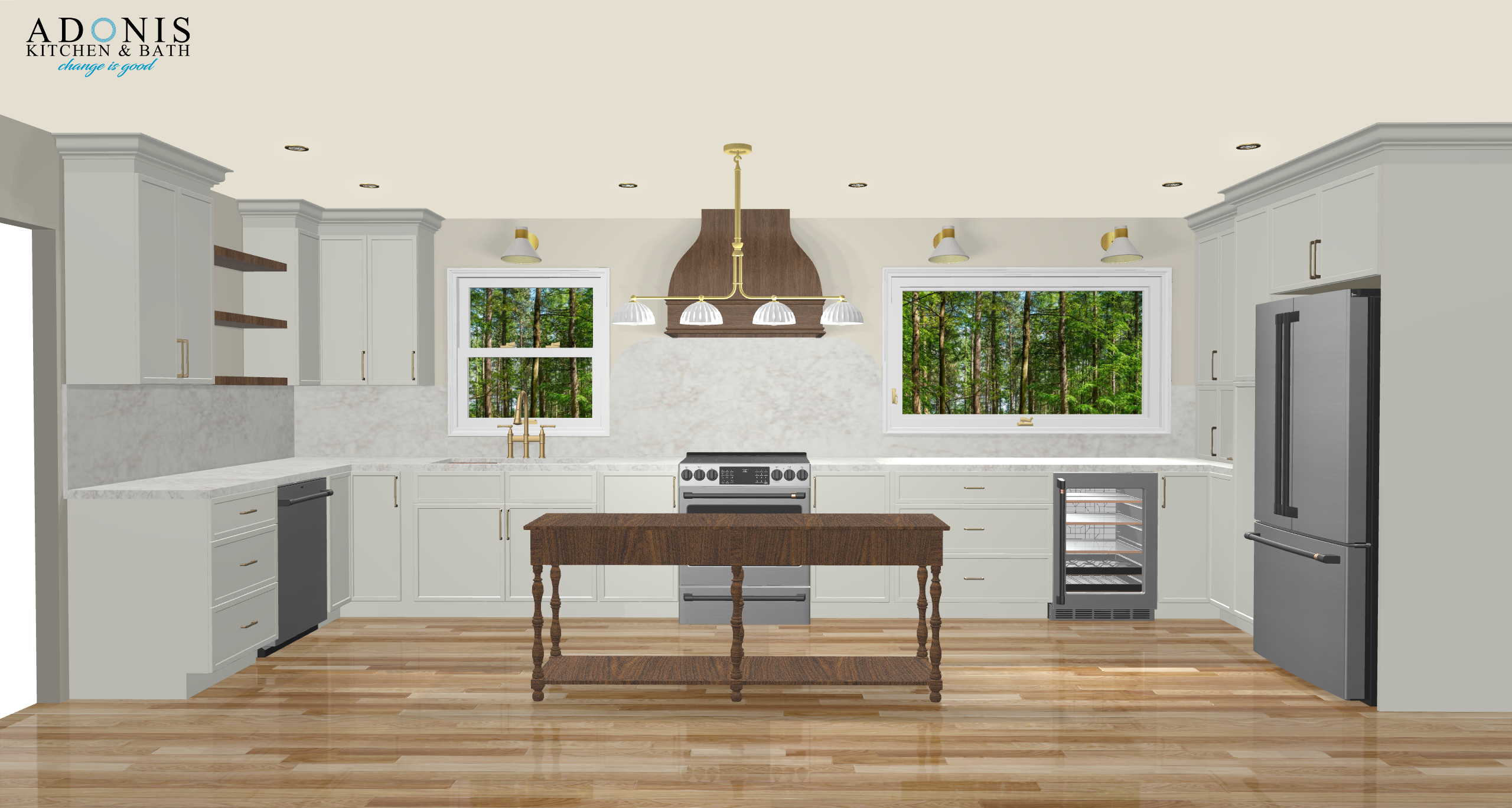 interior shot render with ge cafe white appliances
