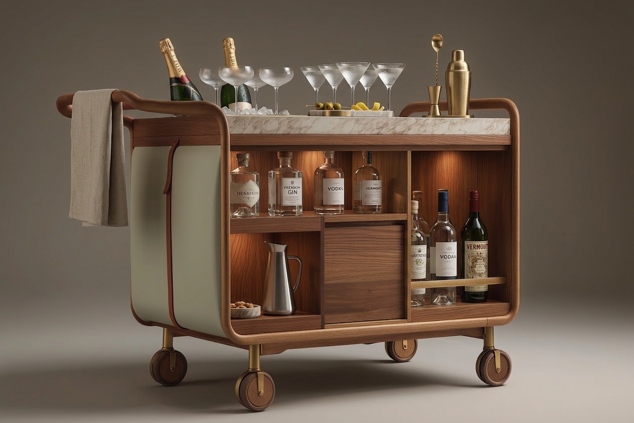 image refinement pass do not change design or layout preserve the existing cart design materials proportions and composition exactly as shown do not change the wood tone marble or overall color palette do not redesign or restyle the cart enhance material quality increase realism and richness of the wood grain deeper contrast finer detail subtle natural variation enhance marble surface with crisp veining and realistic specular highlights refine metal elements with accurate reflections and soft brushed finish lighting correction remove any hazy or foggy overlay image should feel clear and crisp increase contrast and depth while maintaining soft warm ambient lighting add subtle directional light to create gentle shadow definition and dimensionality introduce slight highlight accents on edges to improve material readability detail sharpness increase micro contrast and fine detail across the entire image sharpen edges without creating halos or artifacts improve clarity of glassware bottles and small objects photorealism convert from rendered look to high end editorial product photography accurate reflections natural falloff and realistic surface interaction no blur no softness no ai haze critical constraints no change to geometry no change to layout or object placement no change to styling or composition no desaturation or color shift no new objects added goal a crisp high end photorealistic product shot with depth contrast and material richness maintaining the exact original design intent