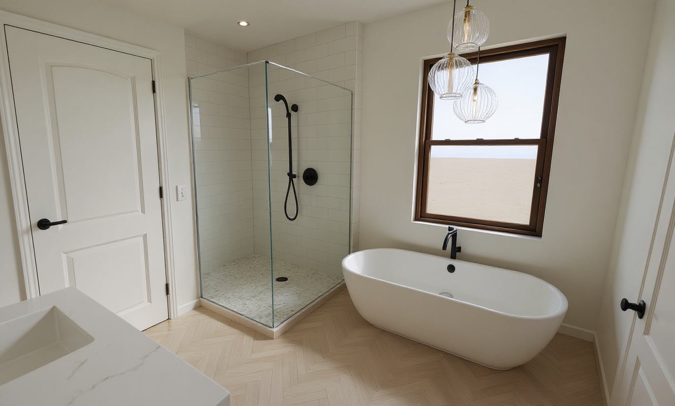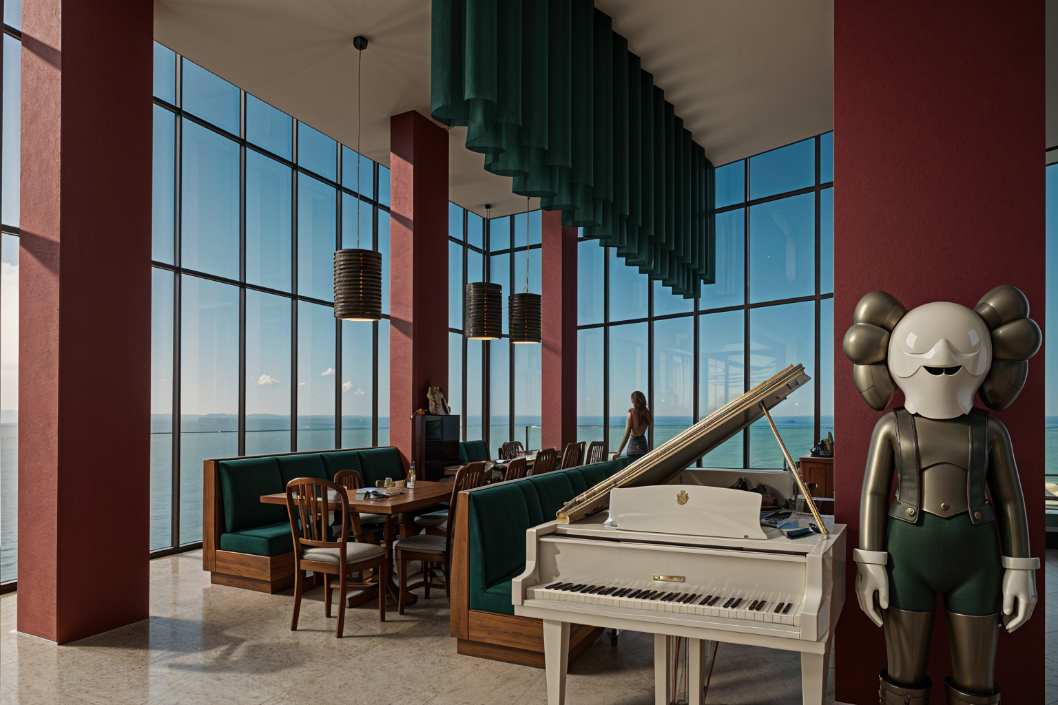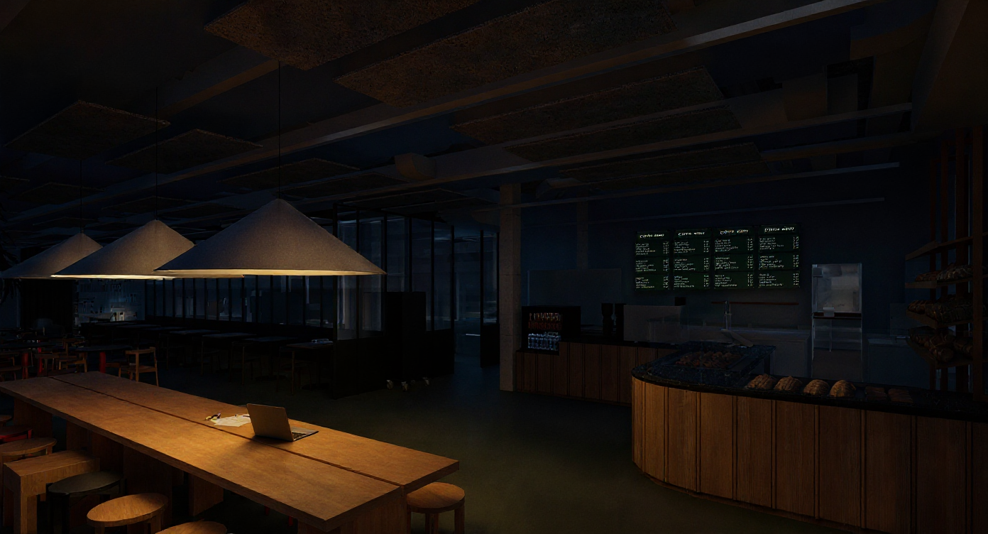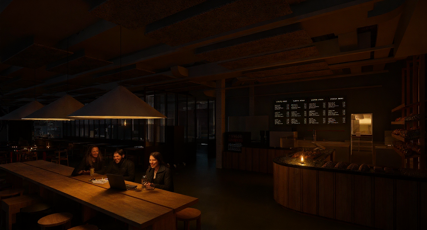 render a luxurious kitchen interior with a warm cozy and elegant atmosphere illuminate the scene with soft indirect lighting to create a sophisticated and intimate mood enhancing material richness and fine detail the floor is made of light colored stone tiles each 120 cm x 120 cm with a smooth matte surface that gently reflects light the countertop is made of emperador dark marble showing deep brown and orange tones with rounded flowing veins as is typical of this stone the marble must look polished deep and vibrant all wood elements including base cabinets from the island and hanging elements from the back composition are made from very dark brown wood with a calm and uniform grain to achieve a refined and timeless appearance in the back composition make the standing base cabinets and all non hanging units completely uniform in a warm brown tone with a smooth elegant surface and no visible grain use smoked oak only for the hanging cabinets above the central gap and for the kitchen island creating a strong connection between these elements the back panel of the back composition must be made of stone harmonizing with the emperador dark marble on the island place the sink on the left and the cooking station on the right add a sleek integrated tap in brushed bronze or gunmetal above the island install a thin linear hanging lamp 3 meters long emitting a warm soft light that enhances the cozy atmosphere bring in natural daylight and adding depth to the scene but don t add visible windows decorate tastefully with wine glasses carafes and subtle elegant accessories use realistic materials warm lighting and soft reflections to emphasize craftsmanship texture and depth ignore the two vertical lines in the front architecture