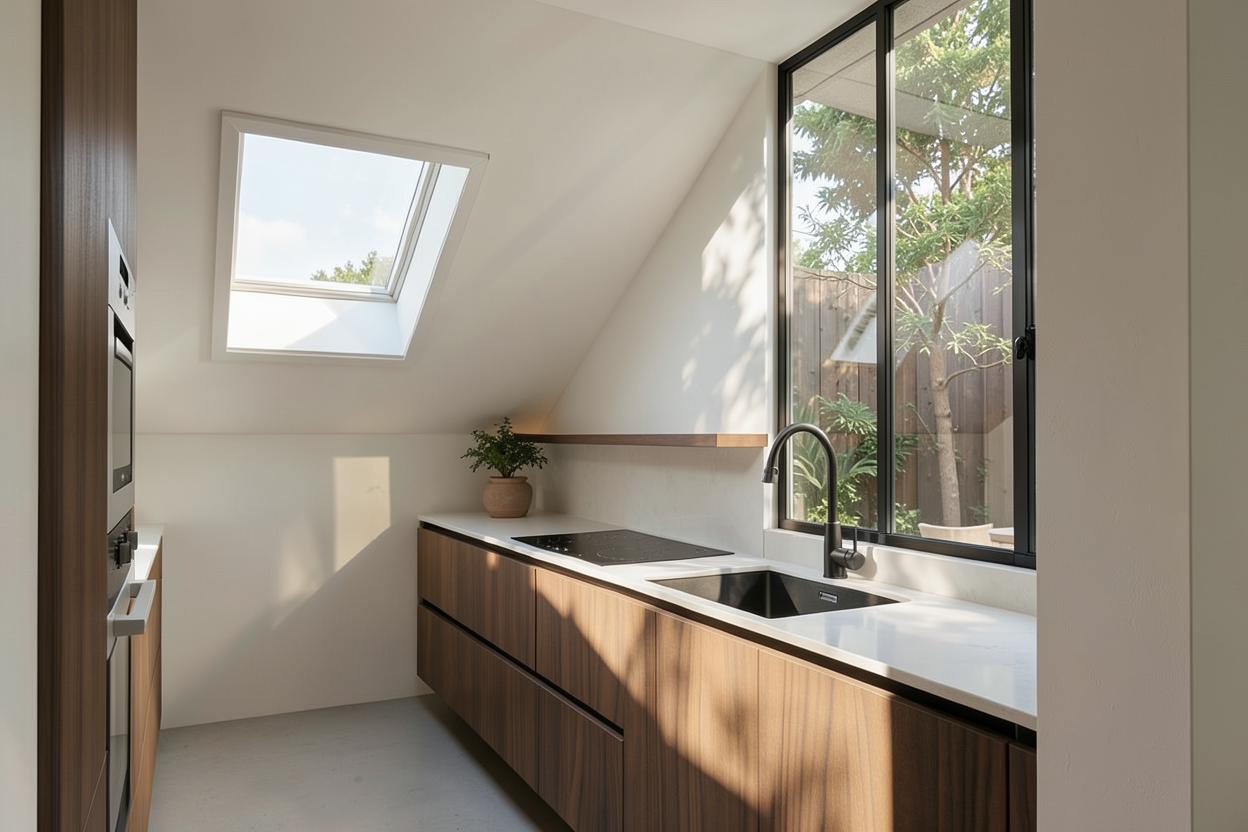 render a beautiful suburban house featuring modern farmhouse architecture the house is white with light gray stone accents and a warm brown shingle roof windows and doors are framed in black for a sleek contrast the garage doors are white with x shaped wooden patterns surrounding the house are lush green lawns and tall trees in the background adding a sense of tranquility the sky is clear and bright blue conveying a peaceful and serene atmosphere