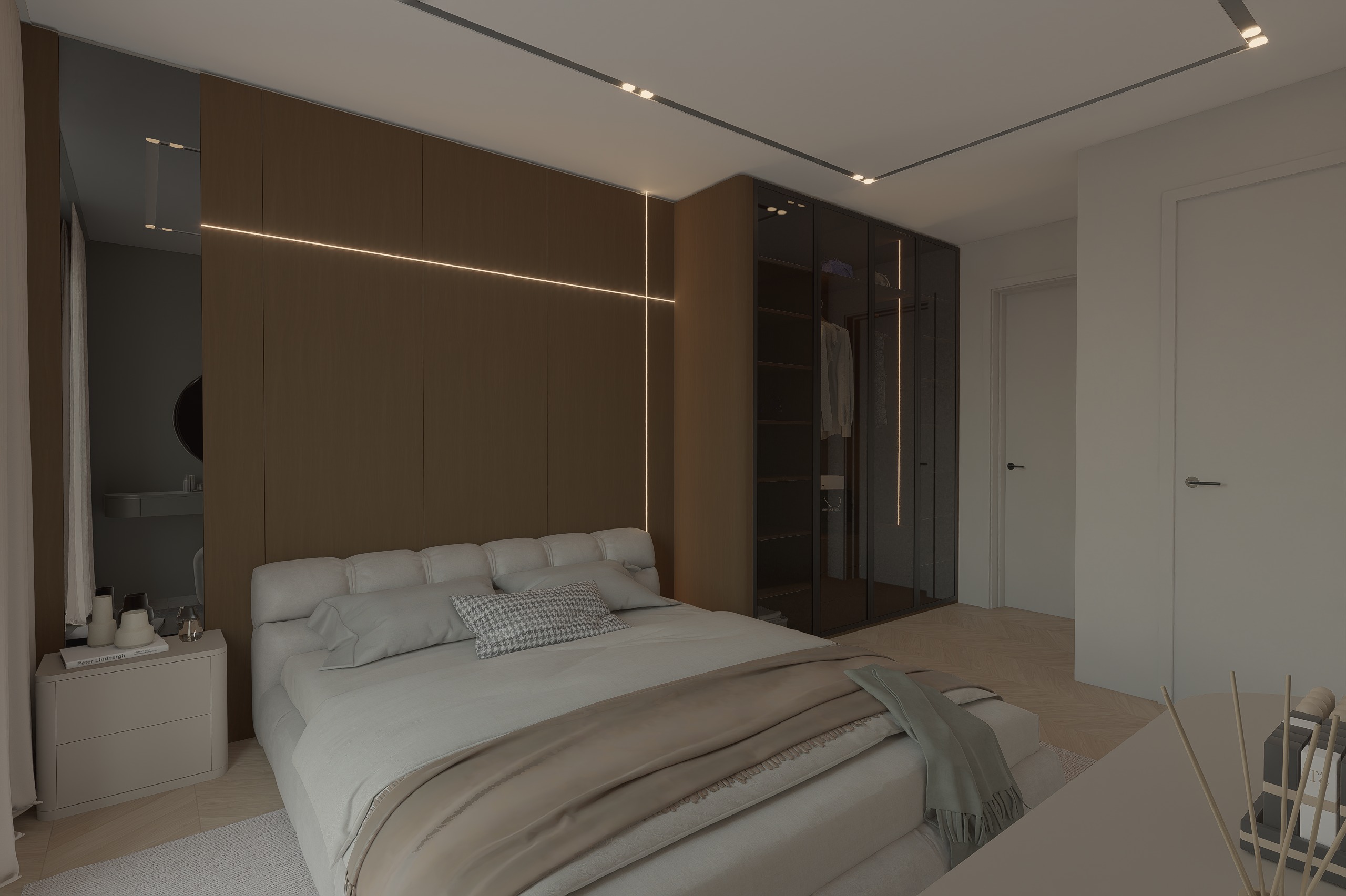 ultra realistic architectural render of the exact same bedroom from this camera angle keep the design layout proportions furniture placement headboard wall wardrobe design glass wardrobe structure led strip positions bedside table curtains doors ceiling lines and parquet floor exactly as they are do not redesign or move anything make the scene look like a real luxury interior photograph with highly realistic materials balanced soft lighting believable shadows accurate reflections and detailed textures the wood wall panels and wardrobe cladding should remain a dark warm walnut tone with seamless premium natural grain and a matte satin finish the bed upholstered headboard bedding pillows and throw should look more realistic with soft natural folds refined fabric texture and subtle depth improve the floor realism with clean light oak parquet texture and natural variation keep the glass wardrobe exactly as designed but add a few elegant clothes visible behind the tinted glass such as neatly hanging garments and a few folded pieces minimal and realistic without making it look crowded keep the atmosphere clean calm modern and premium enhance realism only without changing the design final output should look like a super realistic high end interior photo negative prompt do not change design do not change layout do not move furniture do not change wardrobe structure do not alter led lines do not change camera angle no extra decor no extra furniture no redesign no color shift no messy wardrobe no unrealistic glass reflections no blurry textures no oversharpening no overexposed lighting no distorted proportions