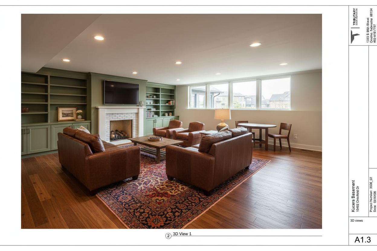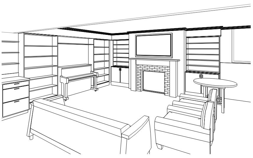 interior shot olive green cabinetry brown wood floors persian rug leather furniture