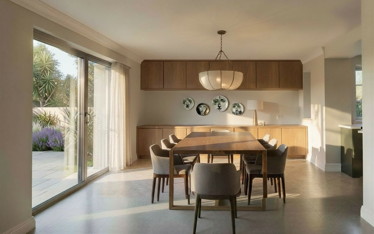 keep everything as it is but add a burgundy glazed decorative bowl to the dining table add the sculpture in the refrence images to the left of the back cabinets make the table lamp base bronze