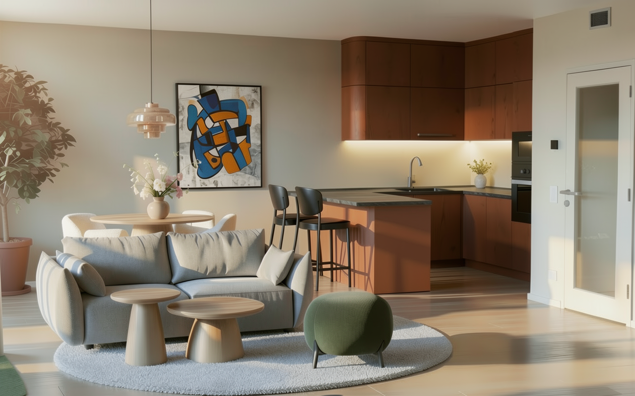 modify only the lower kitchen cabinets the base cabinets under the countertop and the island base change their color to a warm cinnamon brown keep the upper kitchen cabinets exactly as they are with the natural oak wood texture and visible vertical wood grain do not change the material texture or color of the upper cabinets only the lower cabinets should become cinnamon colored do not modify the layout lighting furniture placement or any other elements in the scene