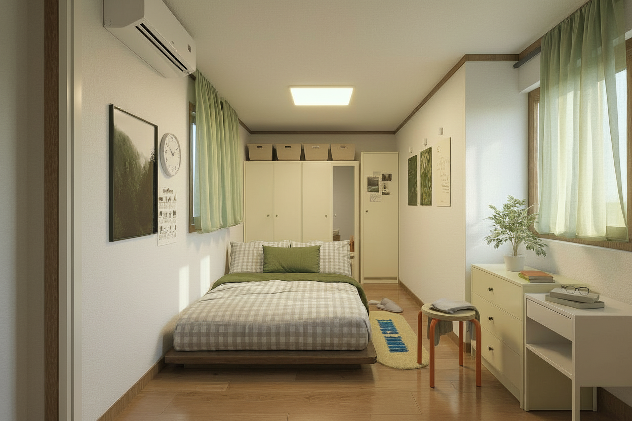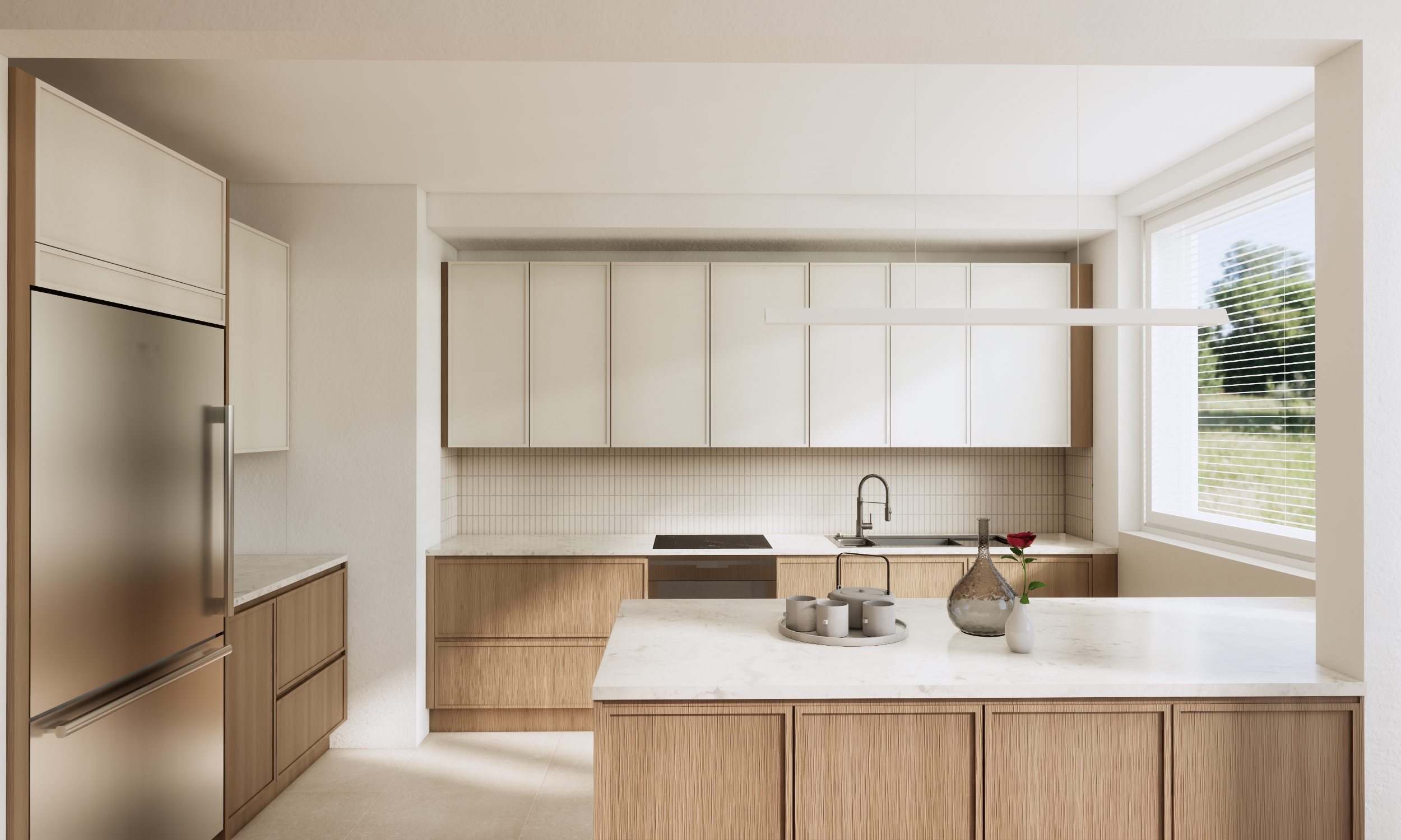 make the white high level cabinets a more green tone and change the tiling on the wall to something more larger also please add in a more late afternoon light