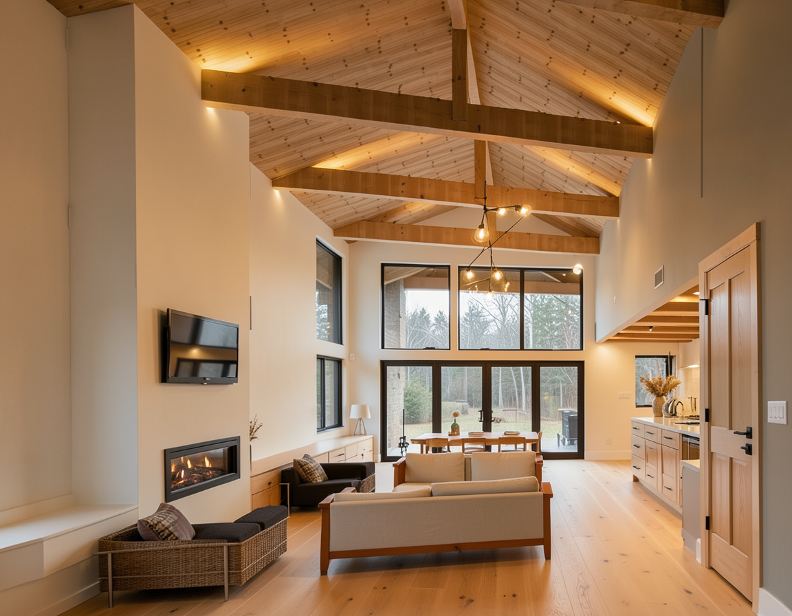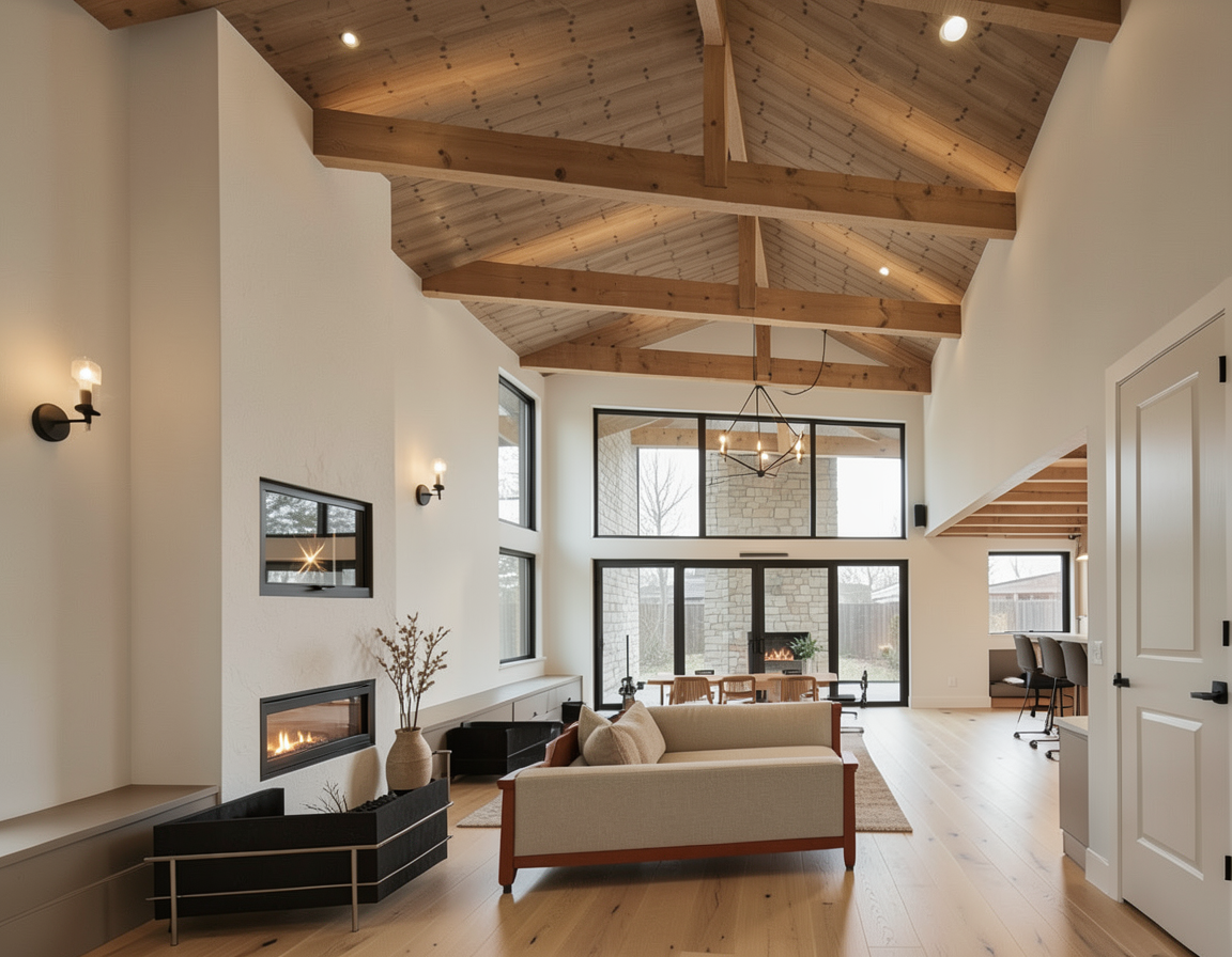 modern farmhouse interior black window frame no windows on the left front add interior lighting light hardwood floor interior lighting and fixtures doors on the right fireplace at rear remove door on the right front make an opening