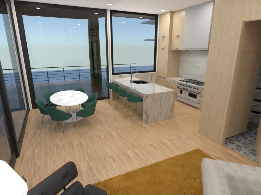 here is an ok render of my kitchen and pantry from the view of the living room outisde the large windows you can see the wrap around deck and railing and one of the trees that the deck is built around please enhance